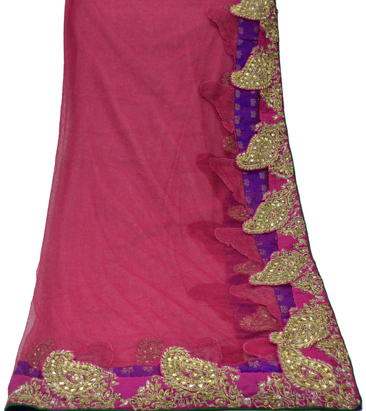 Indian Vintage Heavy Bridal Rani Pink Dupatta Net Mesh Long Stole Hand Embroidered Scarves Zardozi Dabka Zari Wedding Veil Paisley Patch