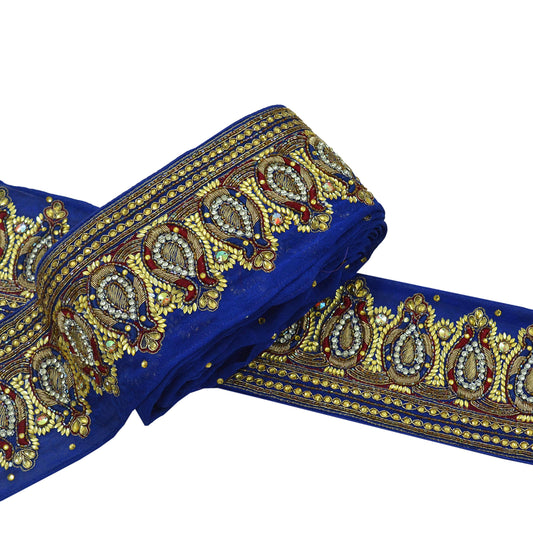 Indian Vintage Royal Blue Sari Border Hand Embroidered Craft Trim Lace Sewing Sari Ribbon Pure Crepe silk Zardozi/Dabka Zari