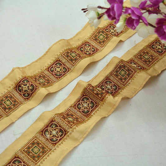 Indian Vintage Henna Beige Sari Border Hand Embroidered Indian Craft Trim Lace Sewing Sari Ribbon Crepe Zardozi/Dabka Zari