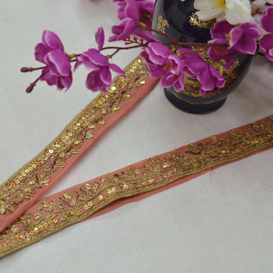 Indian Vintage Peach Sari Border Hand Embroidered Gota Patti Craft Trim Lace Sewing Sari Ribbon Pure silk Zardozi/Dabka Zari Dress making