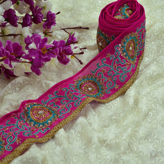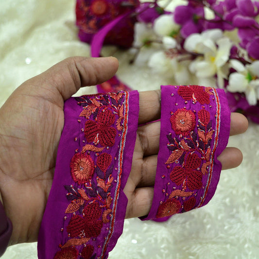 Indian Vintage Magenta Pink Sari Border Hand Embroidered Craft Trim Lace Sewing Pure Georgette Silk Ribbon Recycled Zardozi