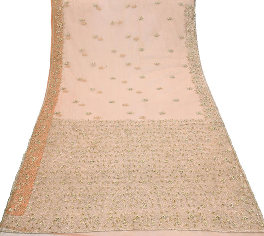 Indian Vintage Heavy Saree Peach Net/Mesh Hand Embroidered Sari Fabric 6Yd Sewing Soft Zardozi/Dabka Zari Sequins Wedding net sarees