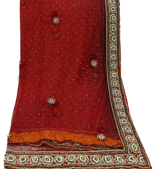 Indian Vintage Heavy Orange & maroon Dupatta Hand Embroidered Net Tissue Mesh Zardozi, Dabka, Zari, Sequins, Kundan Work Bridal Stole