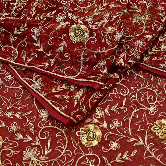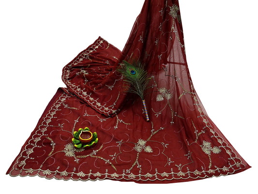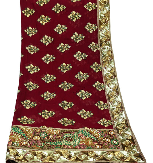 Indian Vintage Heavy Maroon Dupatta Pure Chiffon silk Long Stole Hand Embroidered Scarves Floral Design Stole Veil Wrap Zari Zardozi