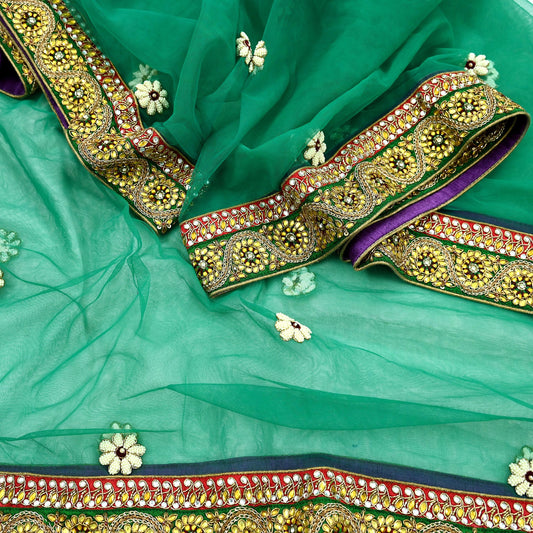 Indian Vintage Heavy Bridal Green Net Dupatta | Hand Embroidered Zardozi Zari Sequins Stole | Floral Design Hijab Veil | Wedding/Party Wear