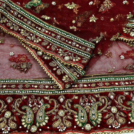 Indian Vintage Heavy Wedding Maroon Dupatta Net Mesh Long Stole Hand Embroidered Scarves Golden Zardozi Zari Sequins Dridal Veil Hijab