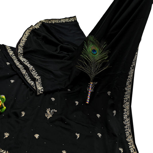 Indian Vintage Heavy Black Sarees 100% Pure Satin Silk Hand Embroidered Sari Craft Fabric 6Yd Sewing Soft Zardozi/Dabka