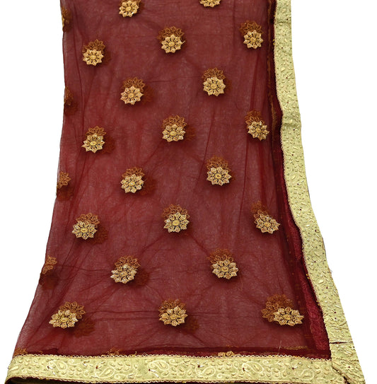 Indian Vintage Maroon Dupatta Net Mesh Long Stole Hand Embroidered Scarves Golden Zardozi Zari Sequins Hijab Veil wrap Boho