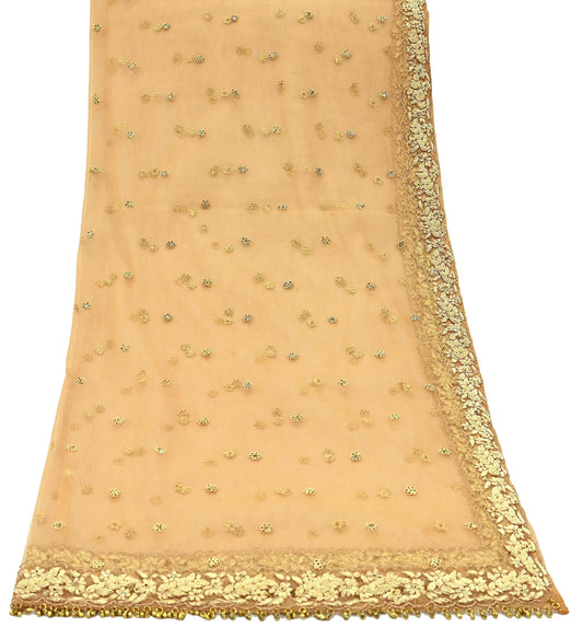Indian Vintage Beige Dupatta Net Mesh Long Stole Hand Embroidered Scarves Golden Zardozi Zari Sequins Stole