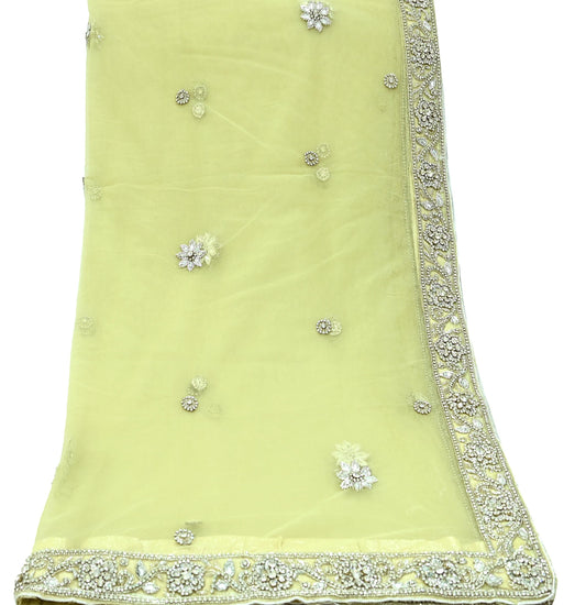 Indian Vintage Heavy Lemon Dupatta Net Mesh Long Stole Hand Embroidered Scarves Silver Zardozi Dabka Zari Stole