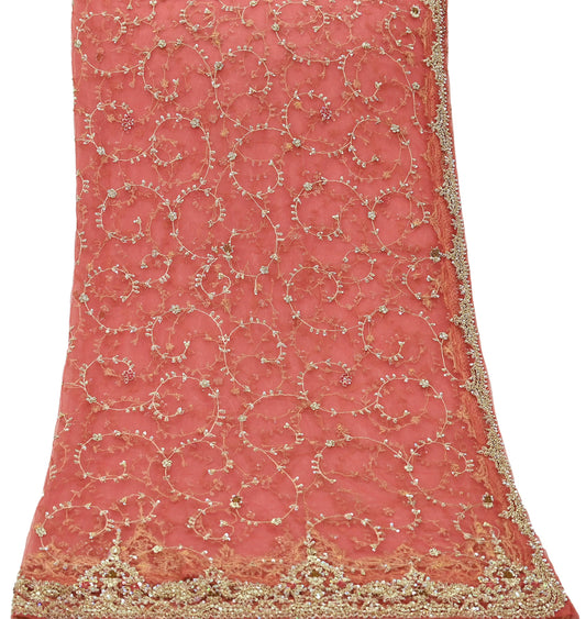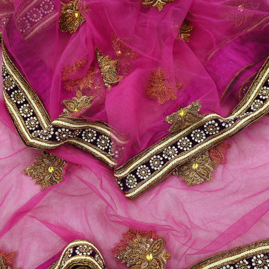 Indian Vintage Heavy Pink Dupatta Net Mesh Long Stole Hand Embroidered Scarves Golden Zardozi Dabka Zari Sequins