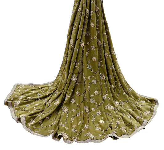 Indian Vintage Heavy Olive Green Dupatta Net Mesh Long Stole Hand Embroidered Scarf Zardozi Zari Sequins Stole