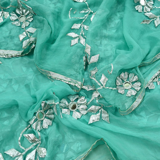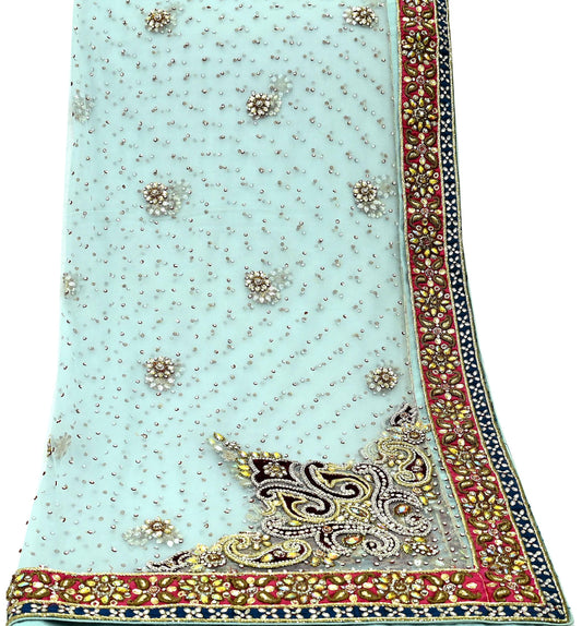 Indian Vintage Heavy Green Dupatta Pure Chiffon silk Long Stole Hand Embroidered Scarves Floral Design Stole Veil Wrap Gota patti Mirror