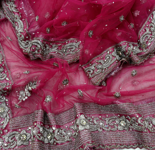 Indian Vintage Heavy Bridal Pink Dupatta Net Mesh Long Stole Hand Embroidered Scarves Silver Zardozi Dabka Zari Sequins Wedding veil
