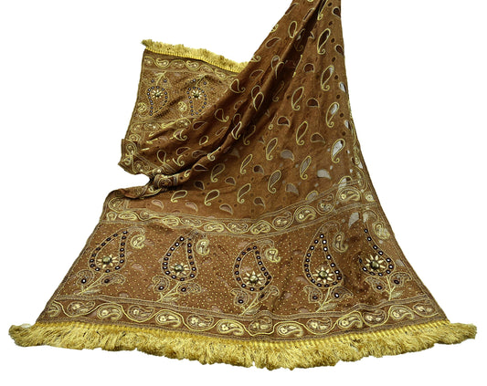Indian Vintage Heavy Wedding Golden & Brown Dupatta Pure Satin Silk Long Stole Hand Embroidered Scarves Golden Zardozi Veil