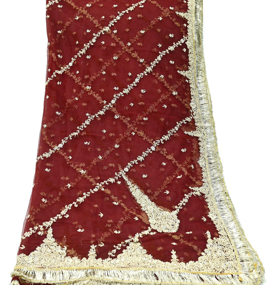 Indian Vintage Heavy Wedding Maroon Dupatta Net Mesh Long Stole Hand Embroidered Scarves Golden Zardozi Zari Sequins Dridal Veil Hijab