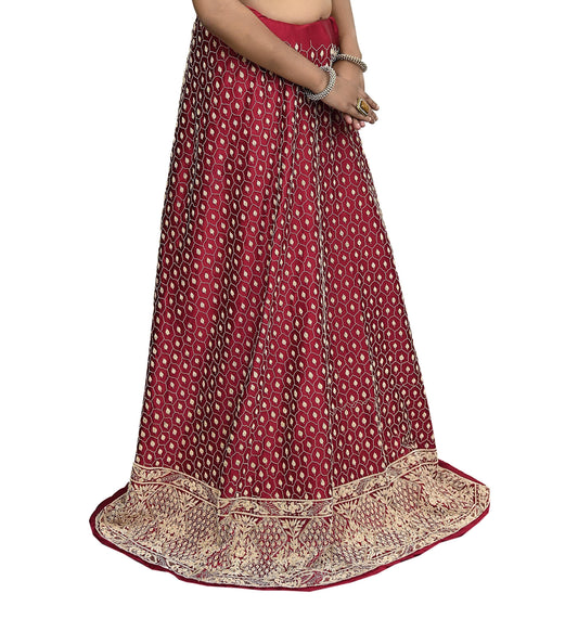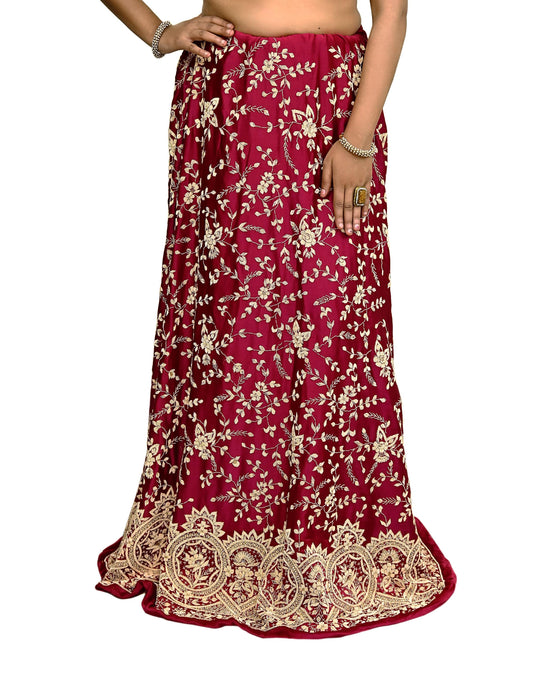 Indian Vintage Heavy Wedding Maroon Unstitched skirt Pure Satin Silk Hand Embroidered Lehenga Bridal wear Ethnic Skirt