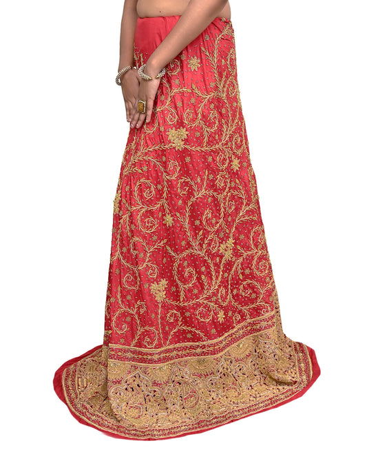 Indian Vintage Heavy Wedding Red Unstitched skirt/ Lehenga Pure Satin Silk Hand Embroidered Bridal wear Ethnic Skirt