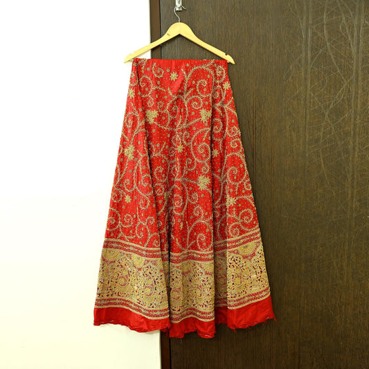 Indian Vintage Heavy Wedding Red Unstitched skirt/Lehenga Pure Silk Hand Embroidered Bridal wear Ethnic Skirt