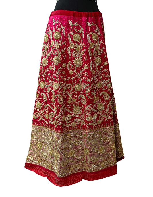 Indian Vintage Heavy Wedding Red Unstitched skirt/ Lehenga Pure Satin Silk Hand Embroidered Bridal wear Ethnic Skirt