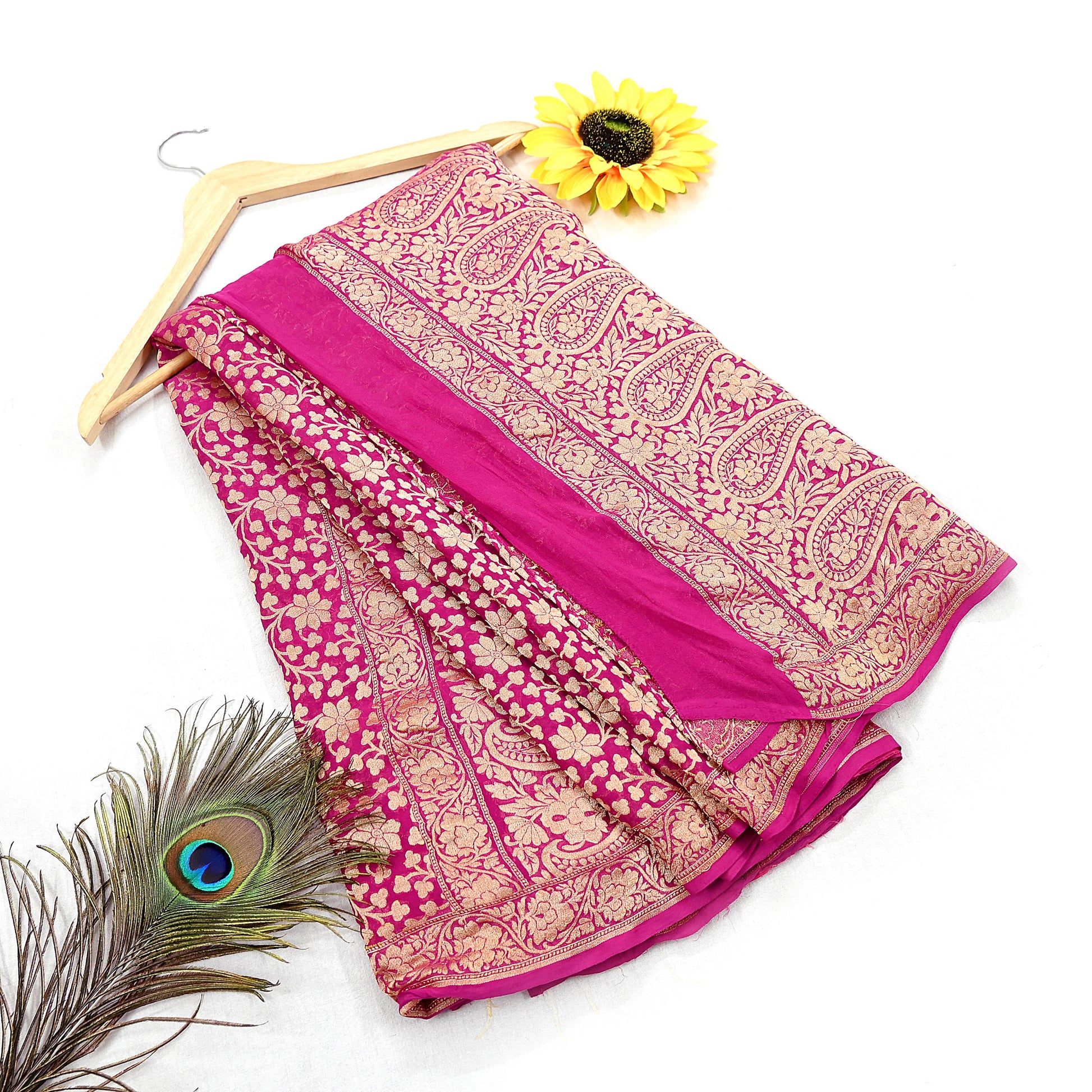 Antique Vintage Magenta Saree Pure Georgette Silk Hand Woven Banarasi Sari Craft Fabric 5Yd Sewing Soft Ethnic Zari Dress Making