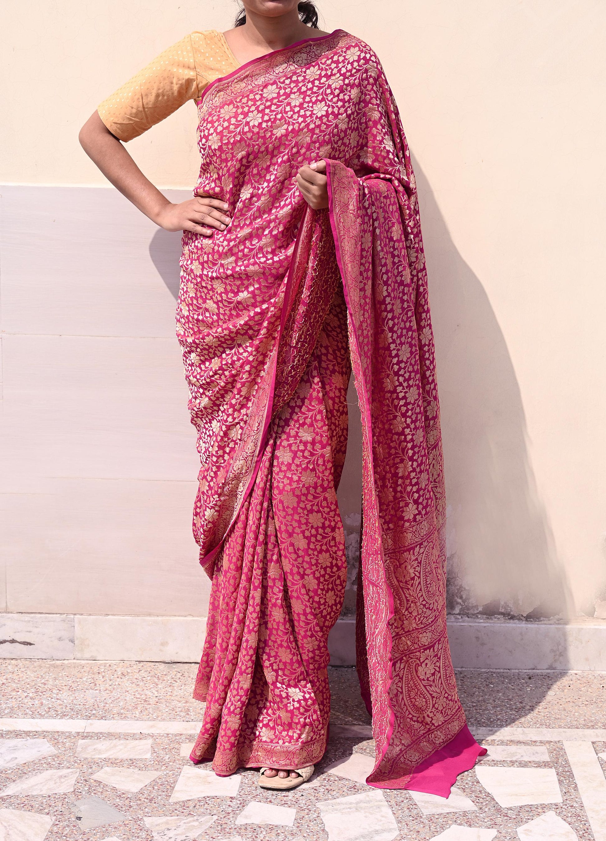 *Awesome Beautiful Vintage Magenta Colored Hand Woven Banarasi Pure Georgette Silk Sari.