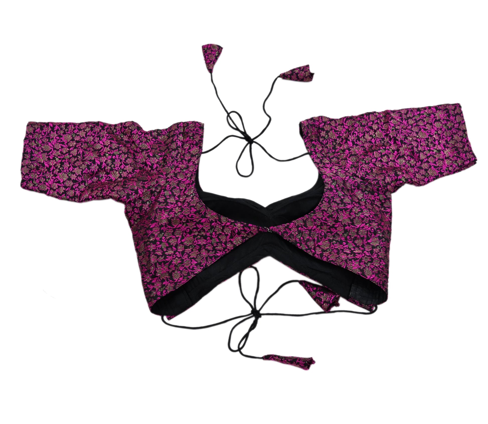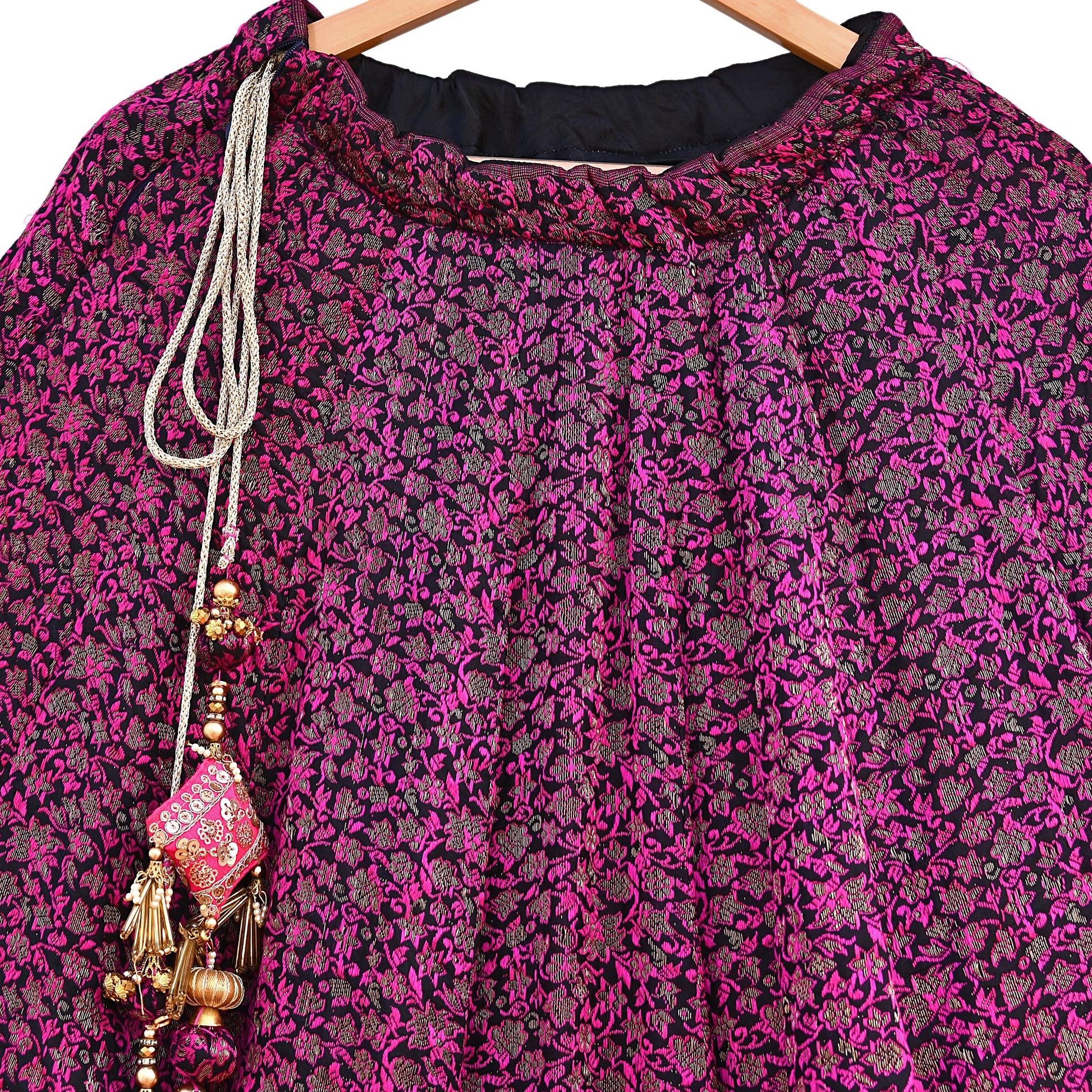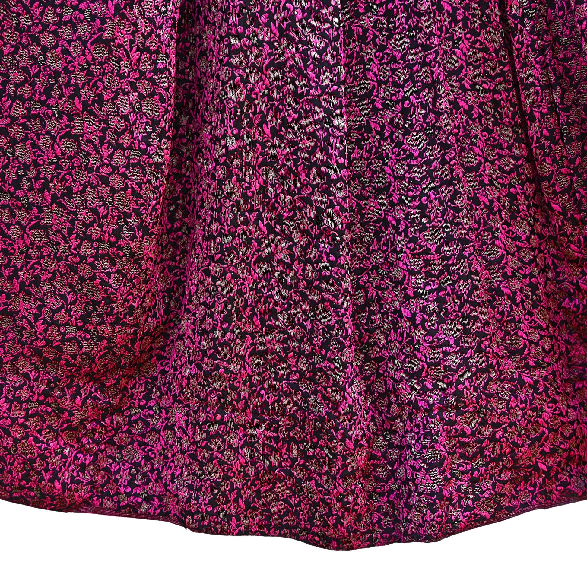 Premium Brocade Weave: Luxurious gold zari floral patterns woven into rich black and pink Pure silk fabric.