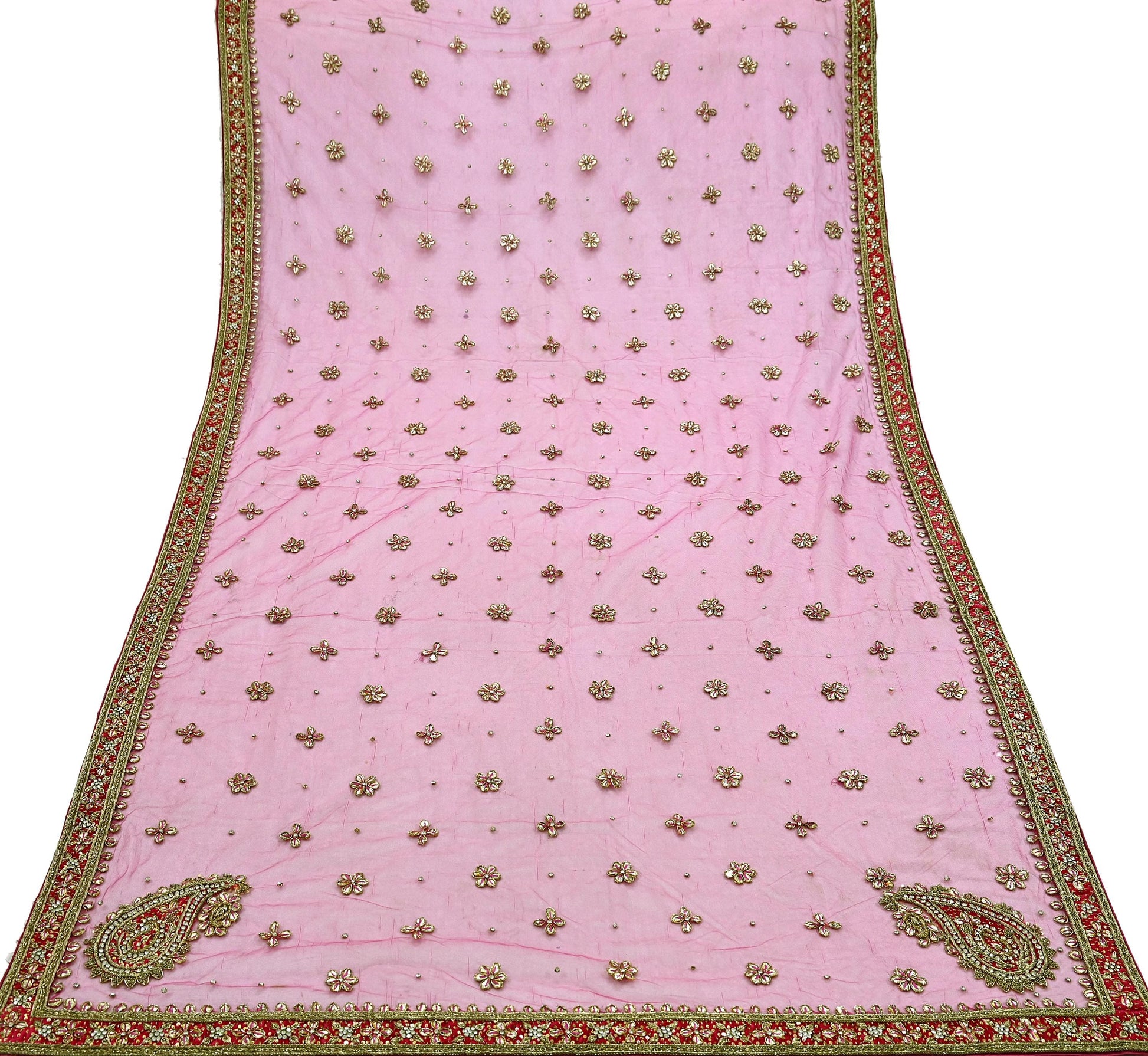 FREE SHIPPING Indian Vintage Heavy Pink Dupatta Net Mesh Long Stole Hand Embroidered Scarf Golden Zardozi Zari Glass Beaded Stole