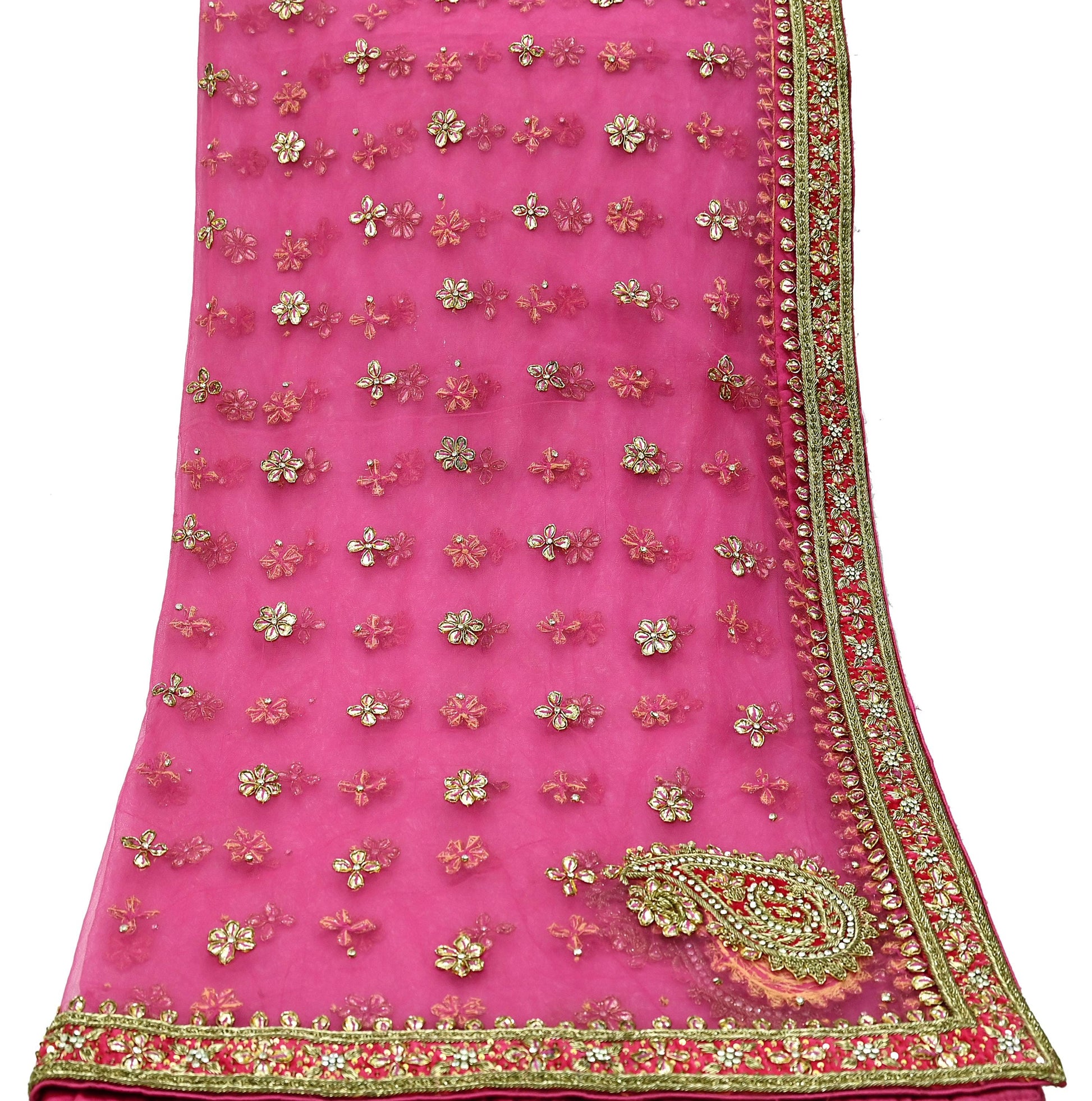 Stunning Beautiful Heavy Dupatta Hand Embroidered Net Dupatta/Stole In Pink Color Fabric. This one of a kind item is difficult to express in words. Border feature is floral & Paisley design embroidered pure metallic Golden zardozi/Dabka/ Zari And White White Stone/Beaded, Golden Sequins, Golden Gota Patti work Border work embellished work is the highlight of the dupatta. Also you can see similar Zardozi, Beaded work with floral pattern in center part adds to its beauty. Pink Velvet Border & Pink Velvet Patches Work is giving a fabulous look to the dupatta. Awesome one !!!