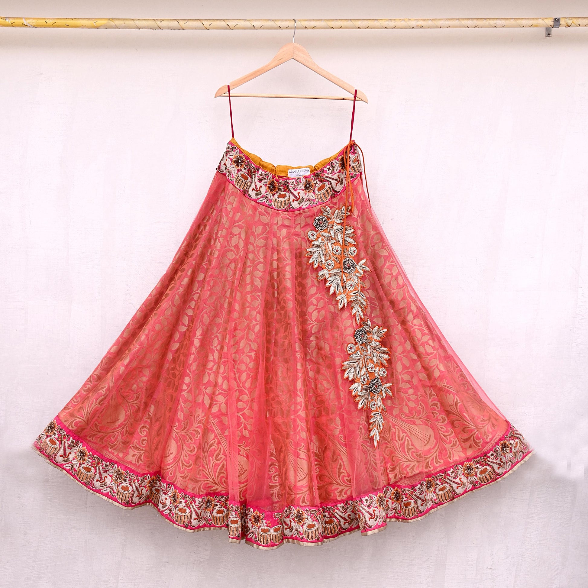 *This one of a kind item is difficult to express in words. Border feature is Musically Instruments design embroidered pure metallic golden Zardozi/Zari, white beads,Red beads, and Orange,brown,mustard Thread work embellished work is the highlight of the Skirt.