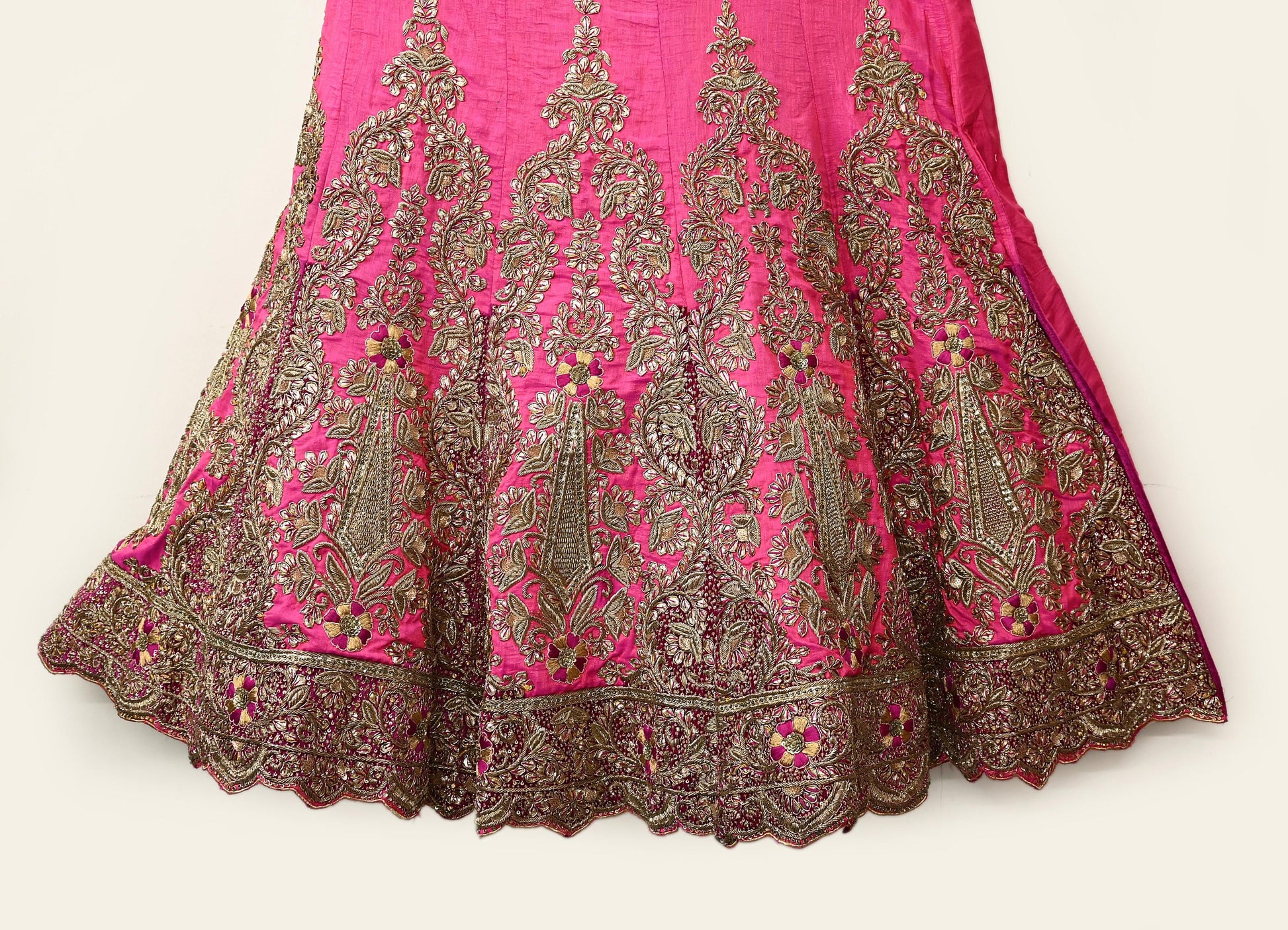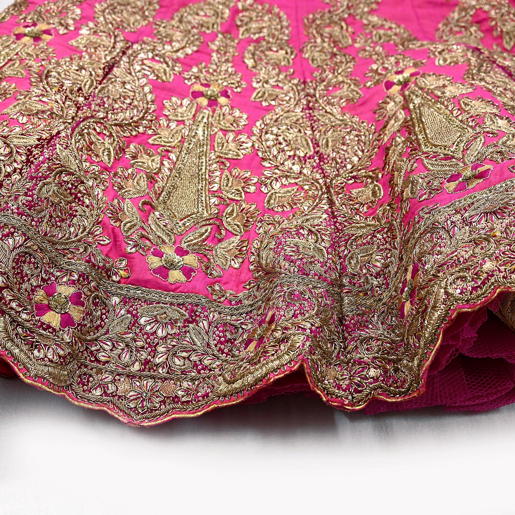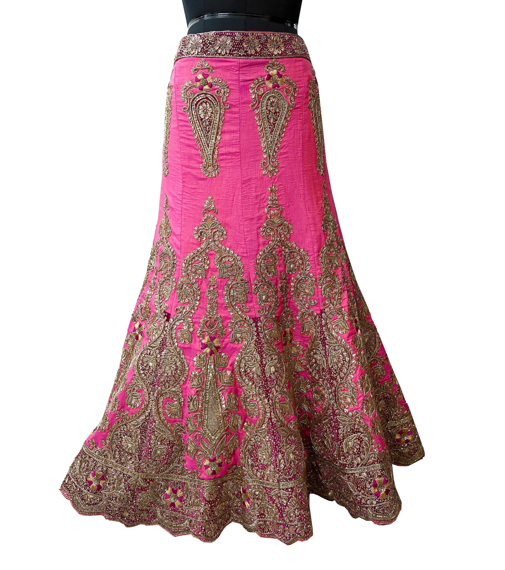 *This one of a kind item is difficult to express in words. Border feature is Paisley design embroidered pure metallic golden zardozi/dabka work, golden zari, golden sequins, Golden glass beads, Golden Gota Patti, Thread work embellished work is the highlight of the Skirt.
