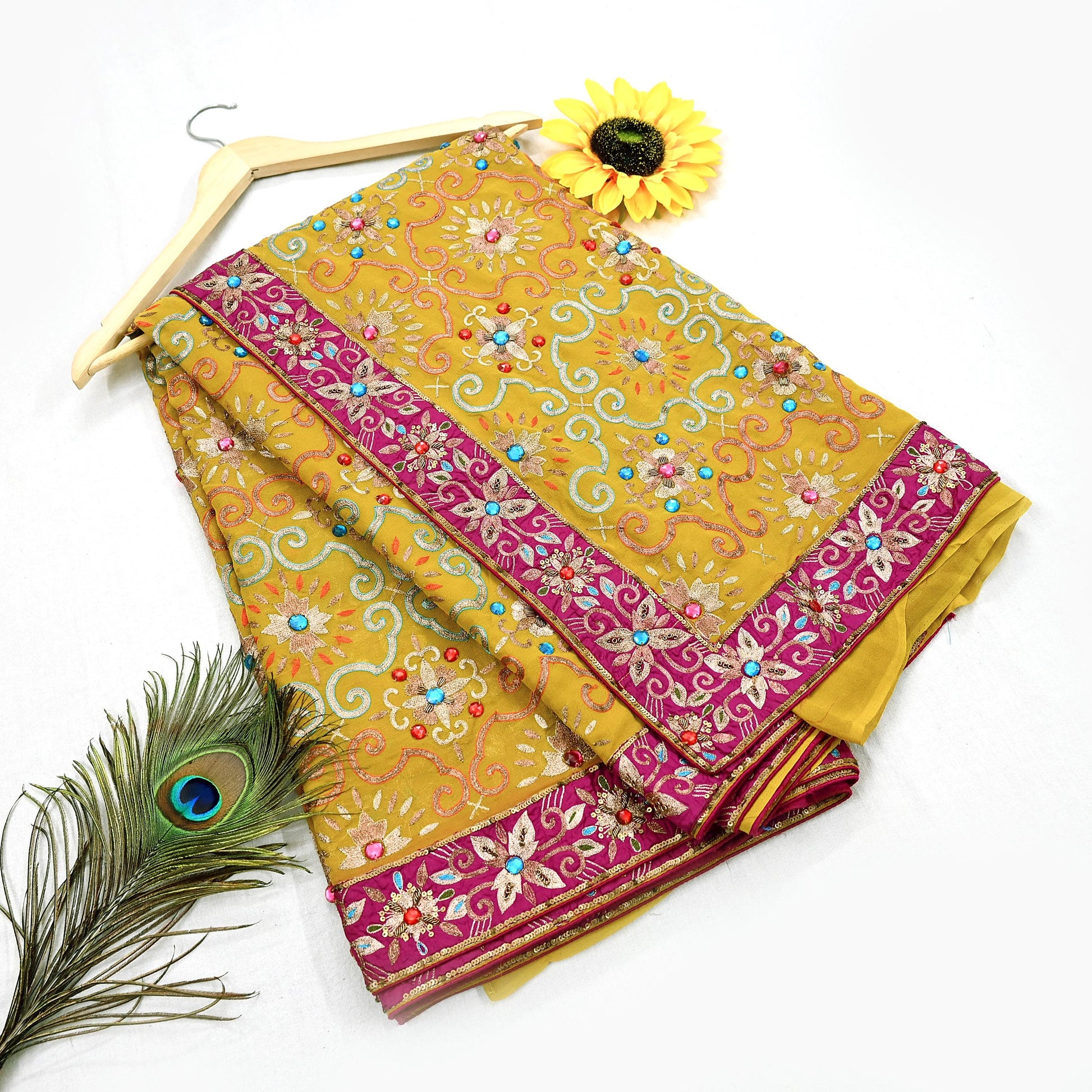 Indian Heavy Sari Mustard Pure Georgette Silk Hand Embroidered Sarees Designer Manish Malhotra 6Yd Sewing Ethnic Bollywood party wear saree
