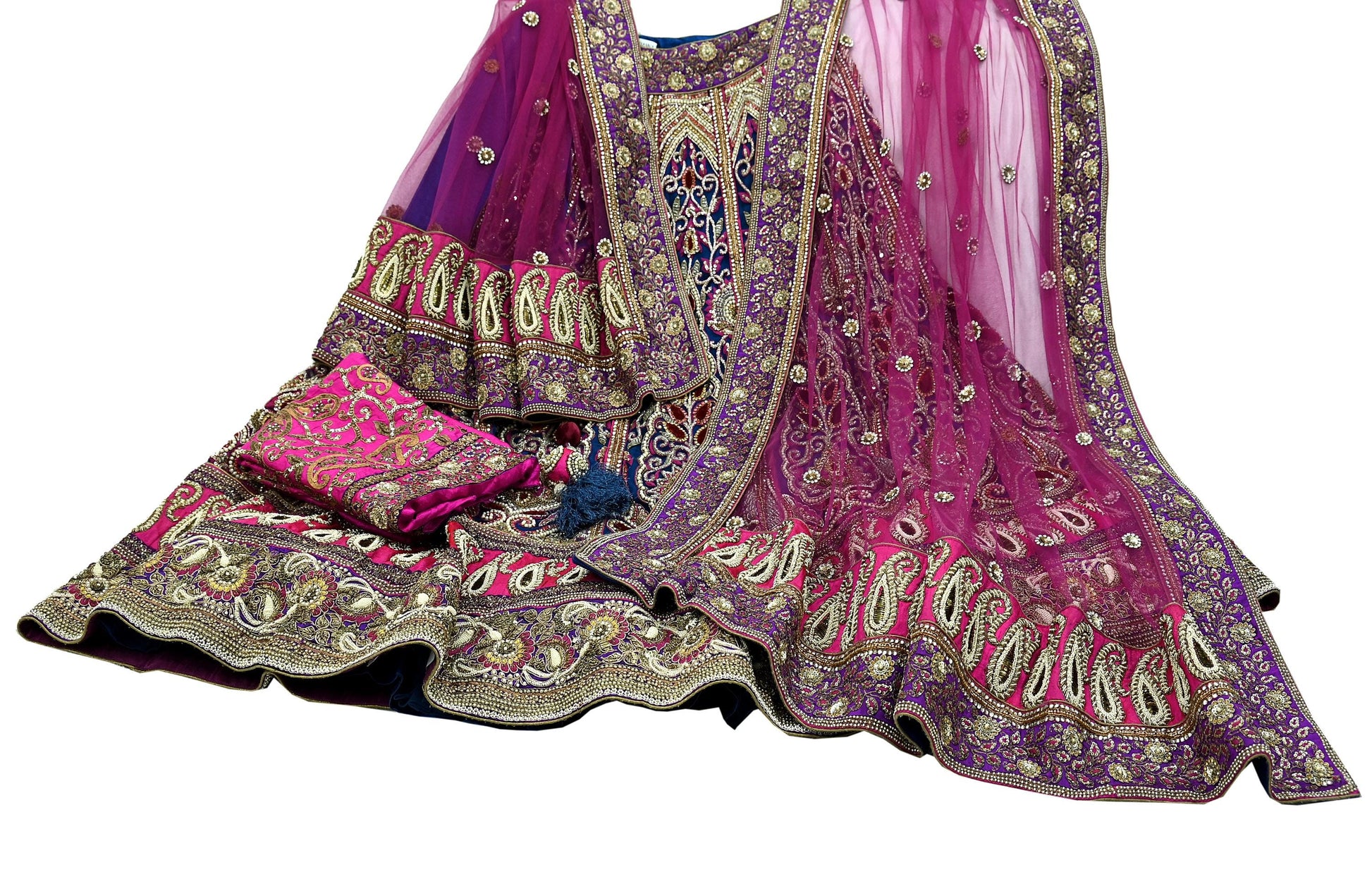 Indian Heavy Wedding Blue & Purple Net/Mesh Hand Embroidered Lehenga 3pcs Set Designer By Anamika Khanna Party Wear With Blouse Fabric