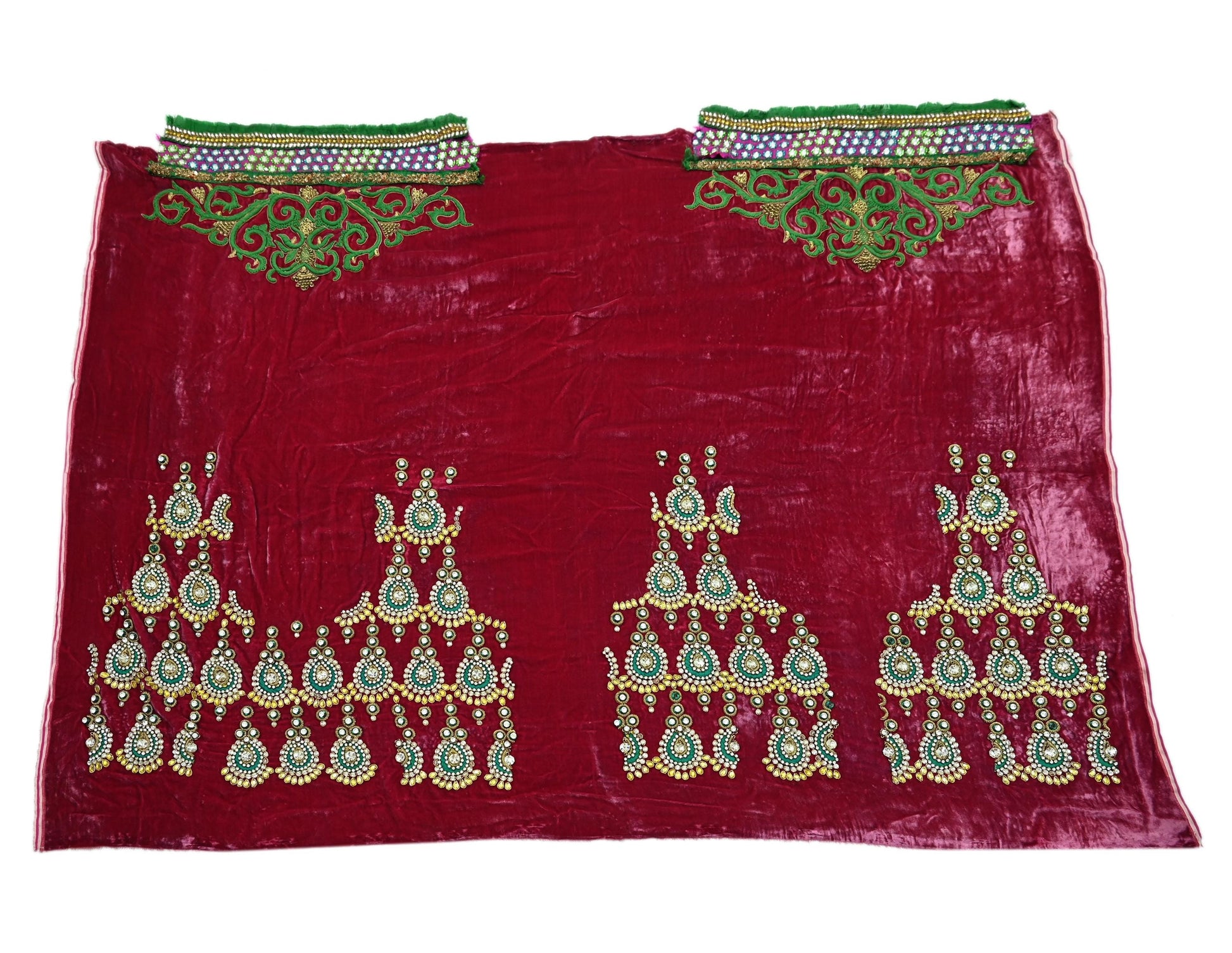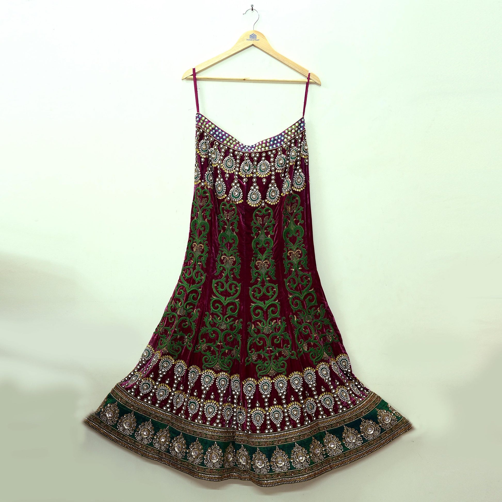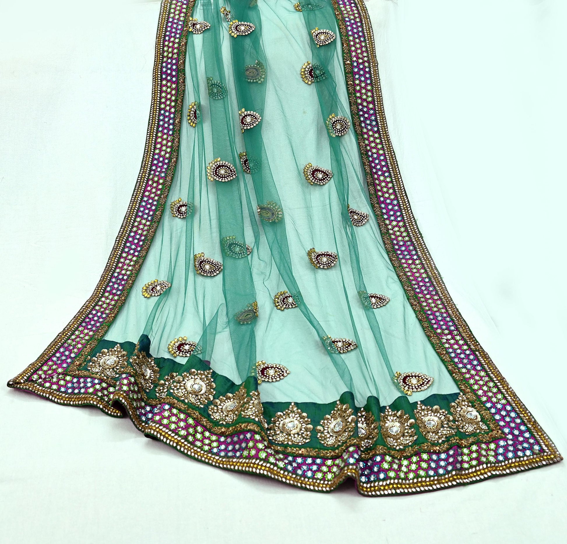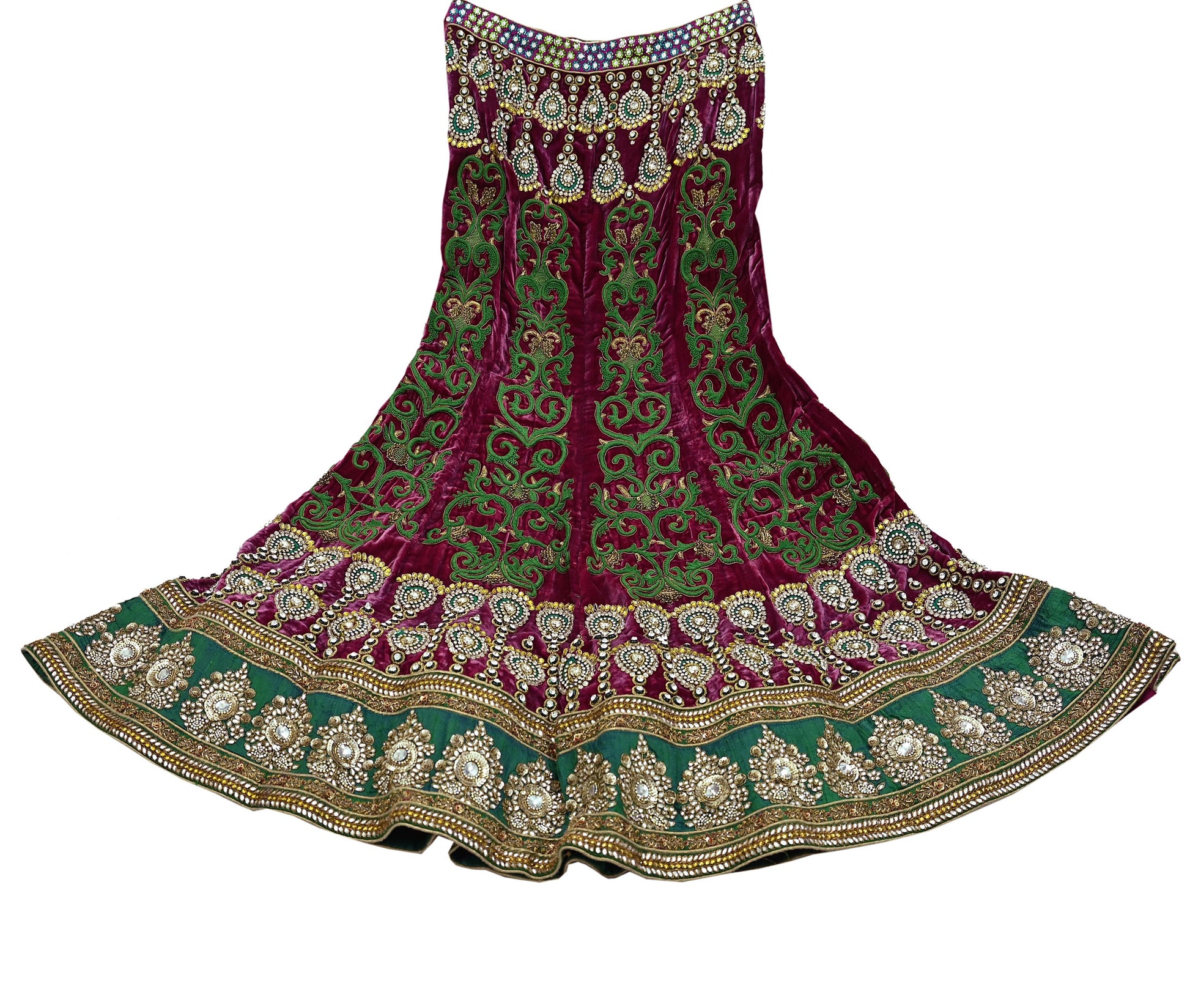 *Vintage Heavy Hand Embroidered Heavy Lehenga/ Dupatta Set Designer By Manish Malhotra Net Dupatta/Stole In Green Color Fabric & Velvet Skirt In Pink Color Fabric.