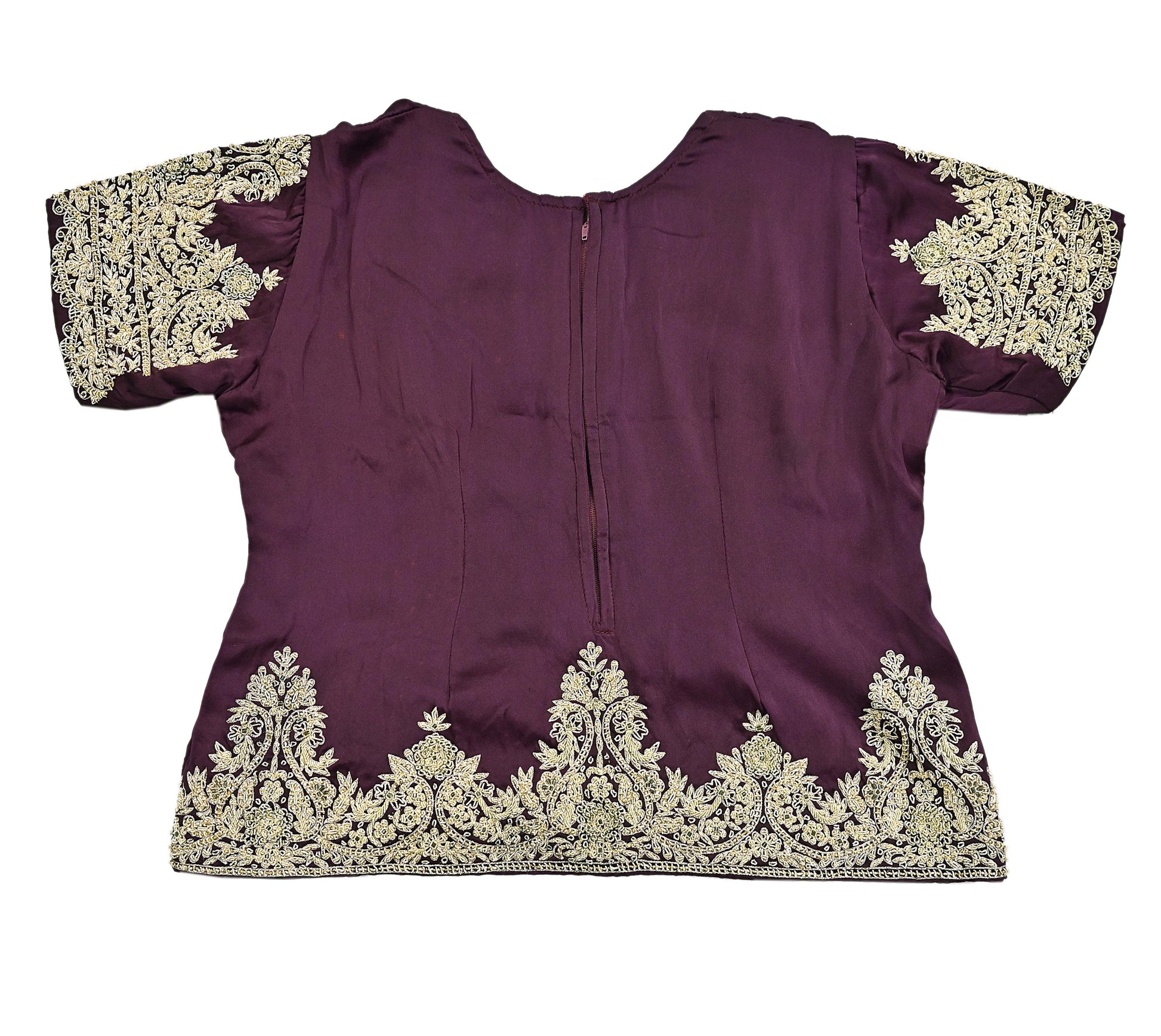 Dupatta: Made from Purple Pure Satin Silk , the borders are adorned with pure metallic golden zardozi/dabka work, golden zari, Golden glass beads, and intricate Golden Border work. The center features delicate floral motifs for an elegant finish.
