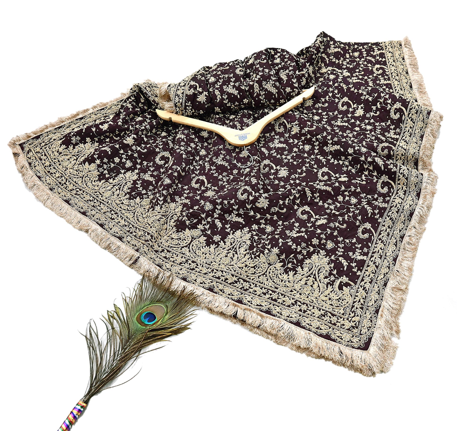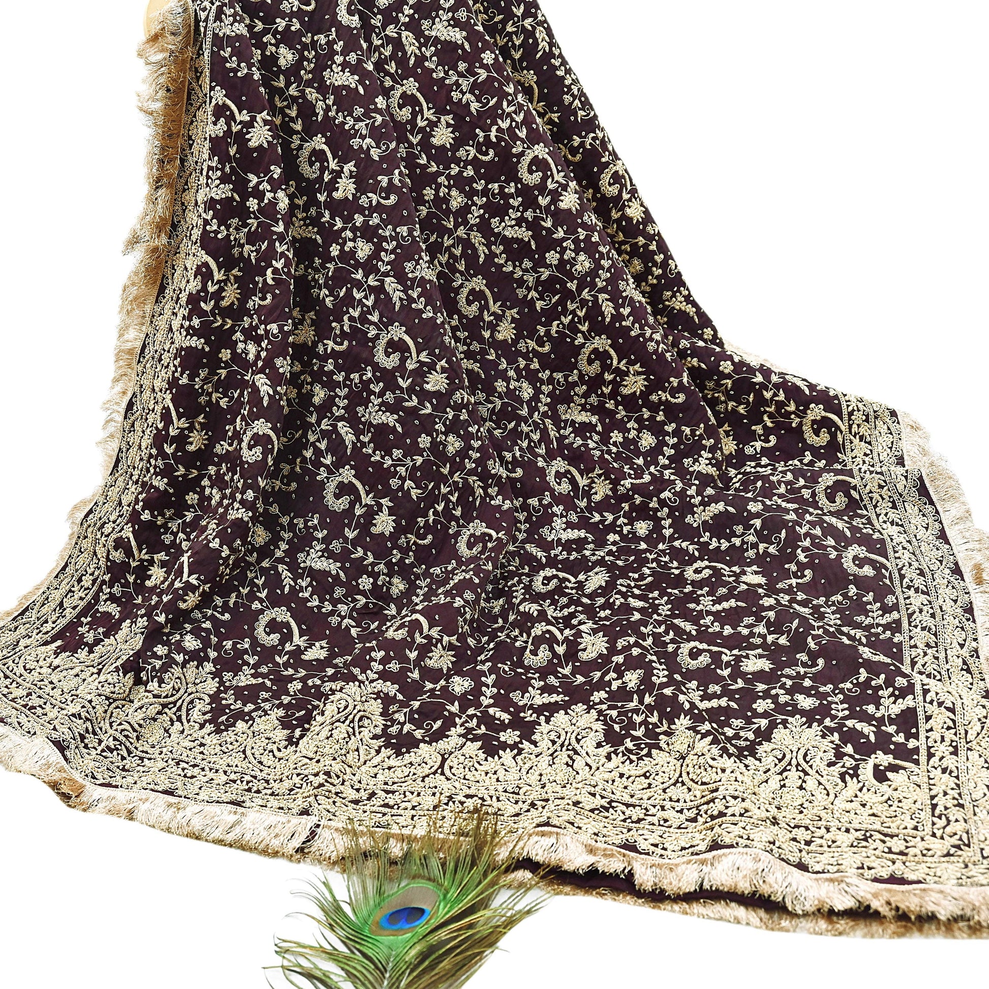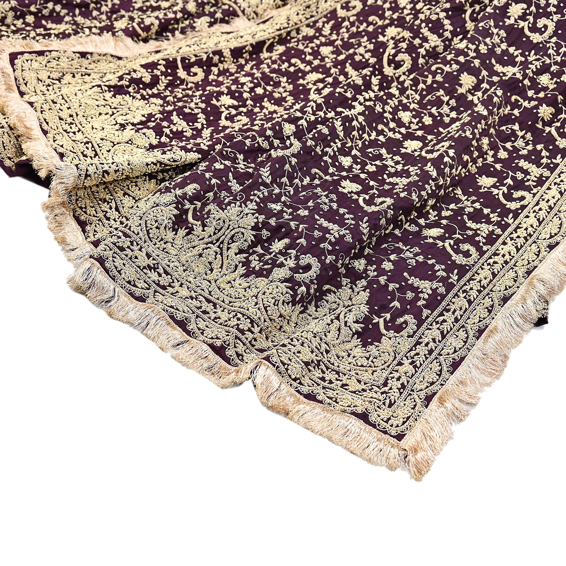 The Maroon base paired with handcrafted metallic embroidery, velvet work, and border artistry creates a truly timeless bridal or festive outfit—ideal for weddings, receptions, and grand occasions.