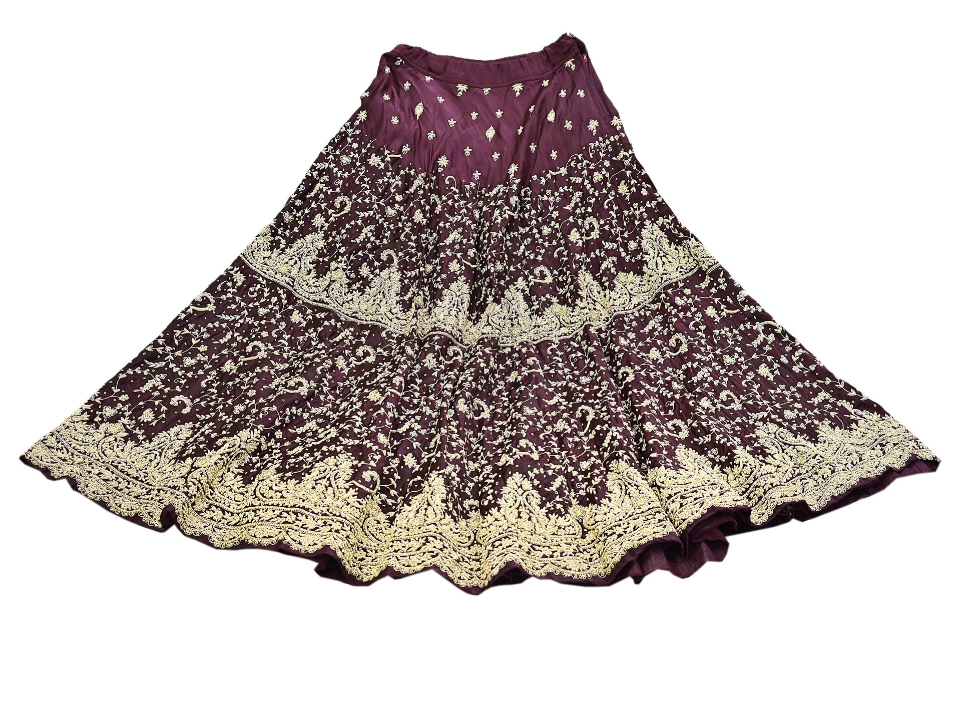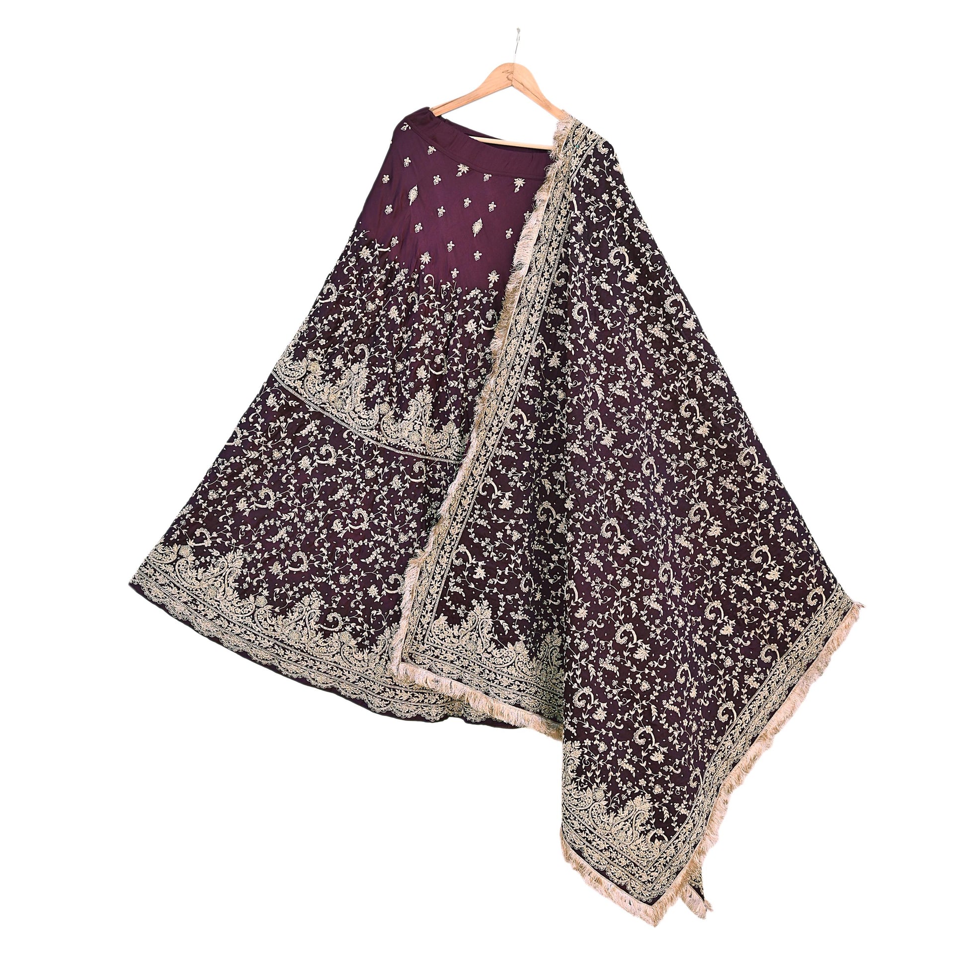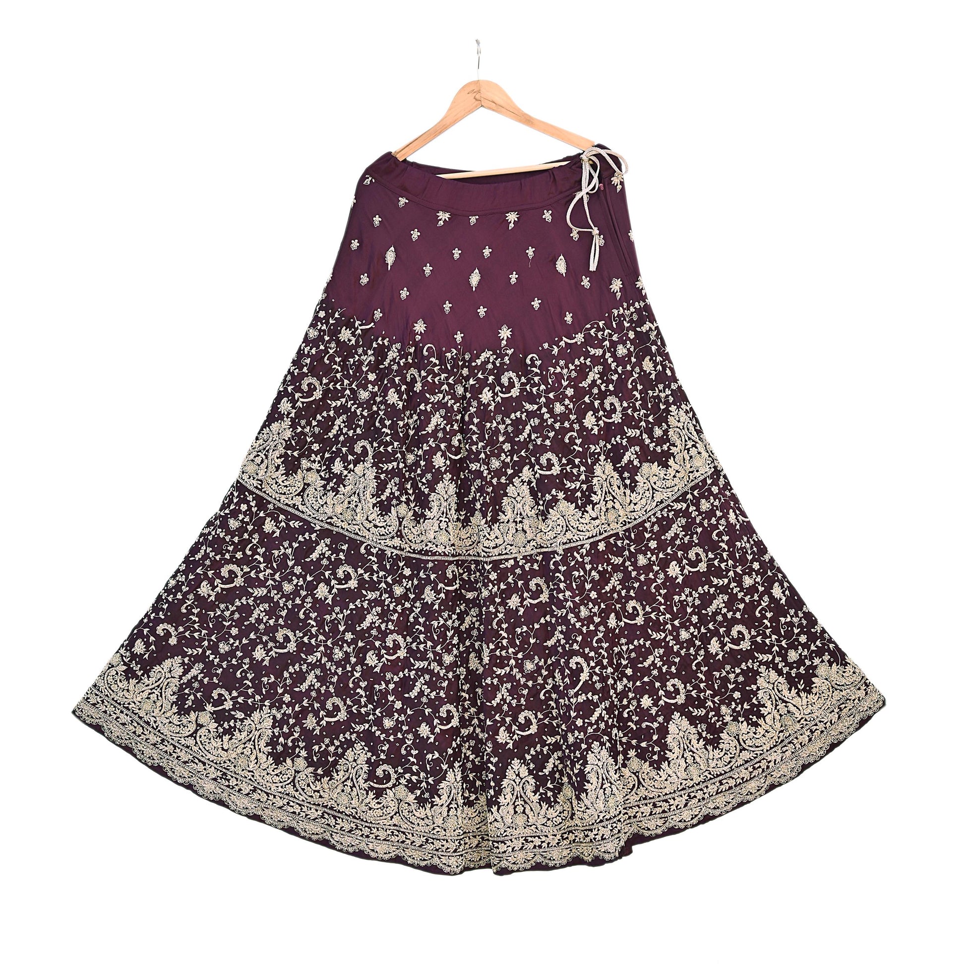 Lehenga Skirt: Crafted in Purple Pure Satin Silk work and a generous 156-inch flair for a majestic drape.