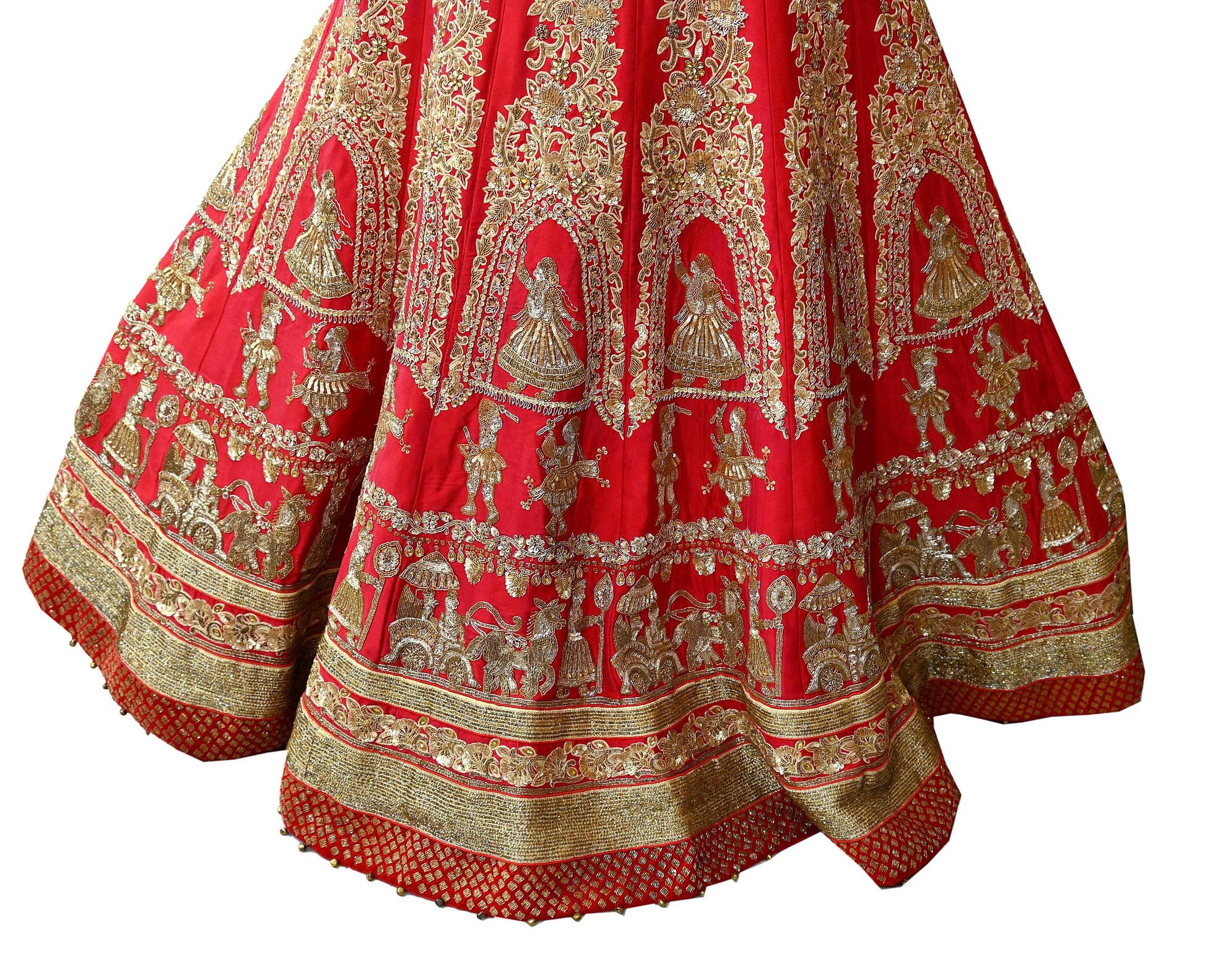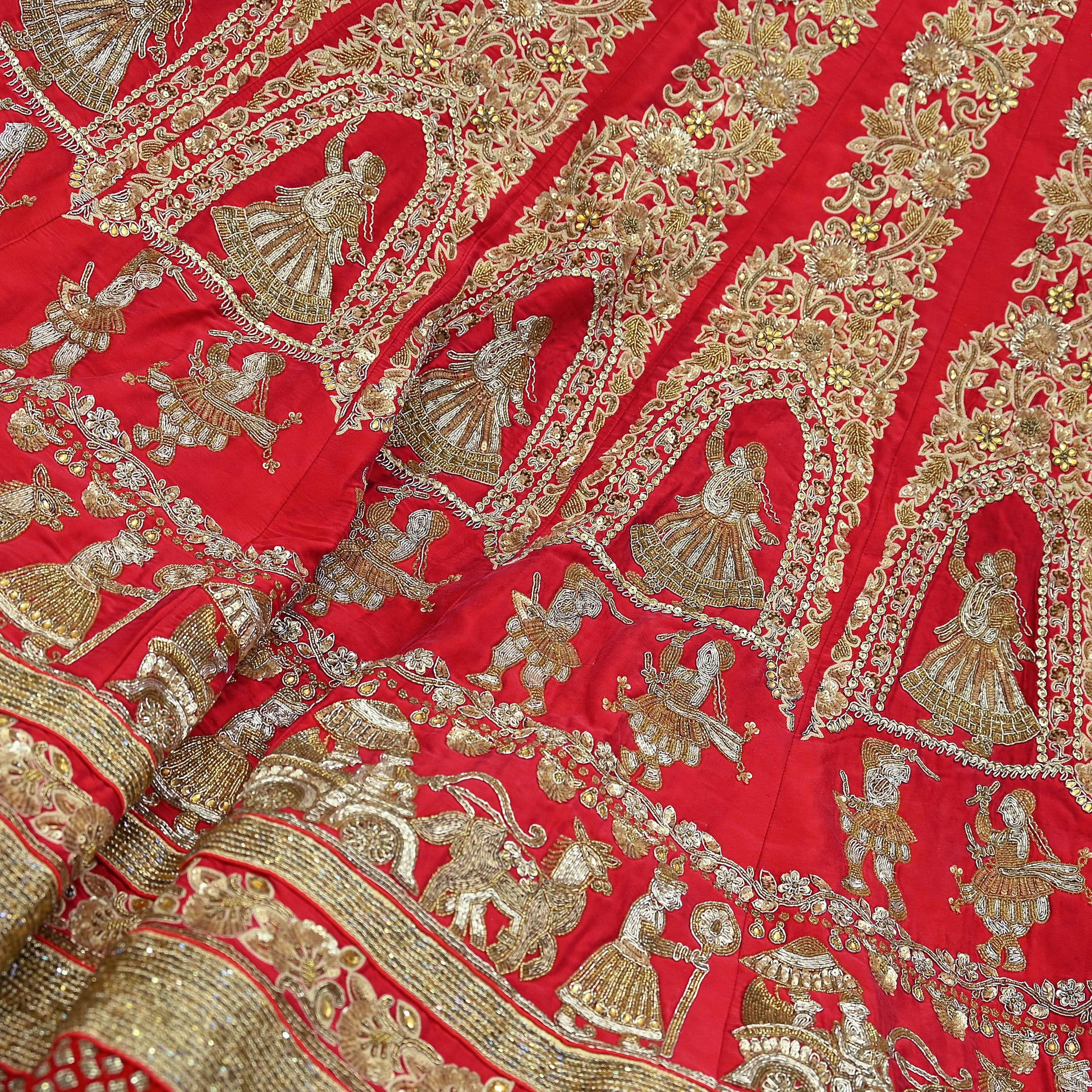 *This one of a kind item is difficult to express in words. Border feature is Lady design embroidered pure metallic golden zardozi/dabka embroidery, golden zari, golden sequins, yellow beads, Golden beads, Golden Glass Beaded, Beige Thread and Mukesh Wedding Theme, humans, horses motifs in the center