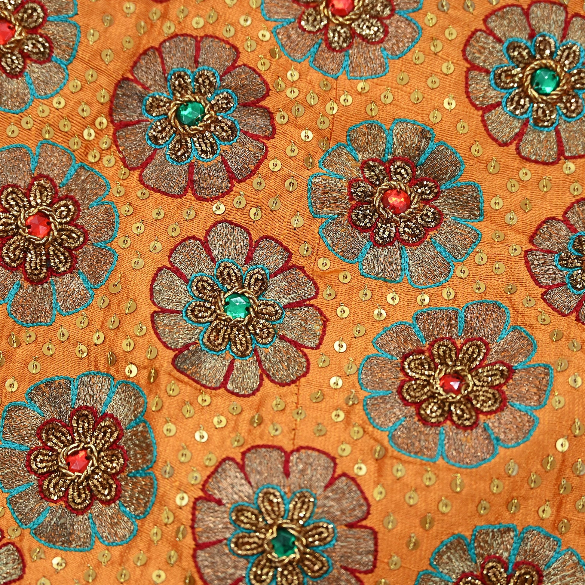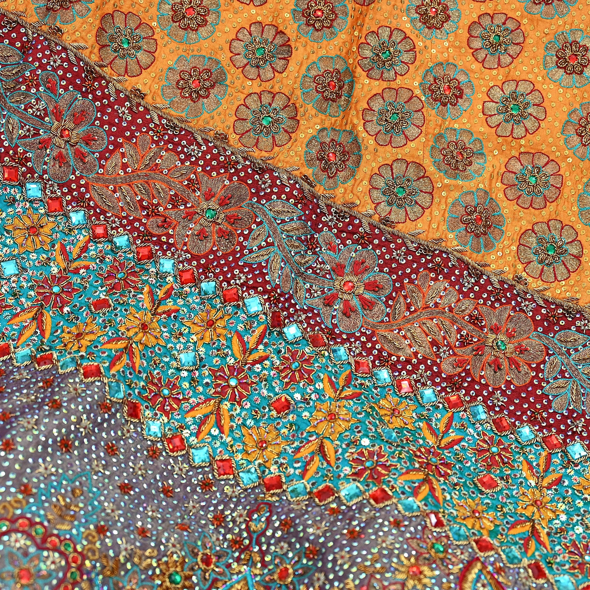 *Vintage Heavy Hand Embroidered Heavy Lehenga/ Skirt Set Designer By Manish Malhotra Pure Chanderi Silk Fabric In Saffron, Blue & Maroon Color.