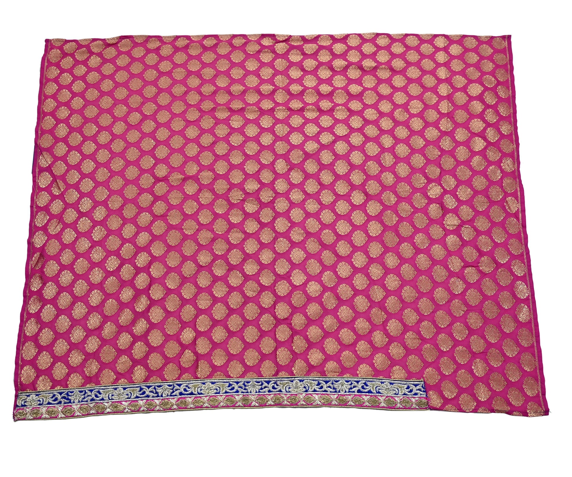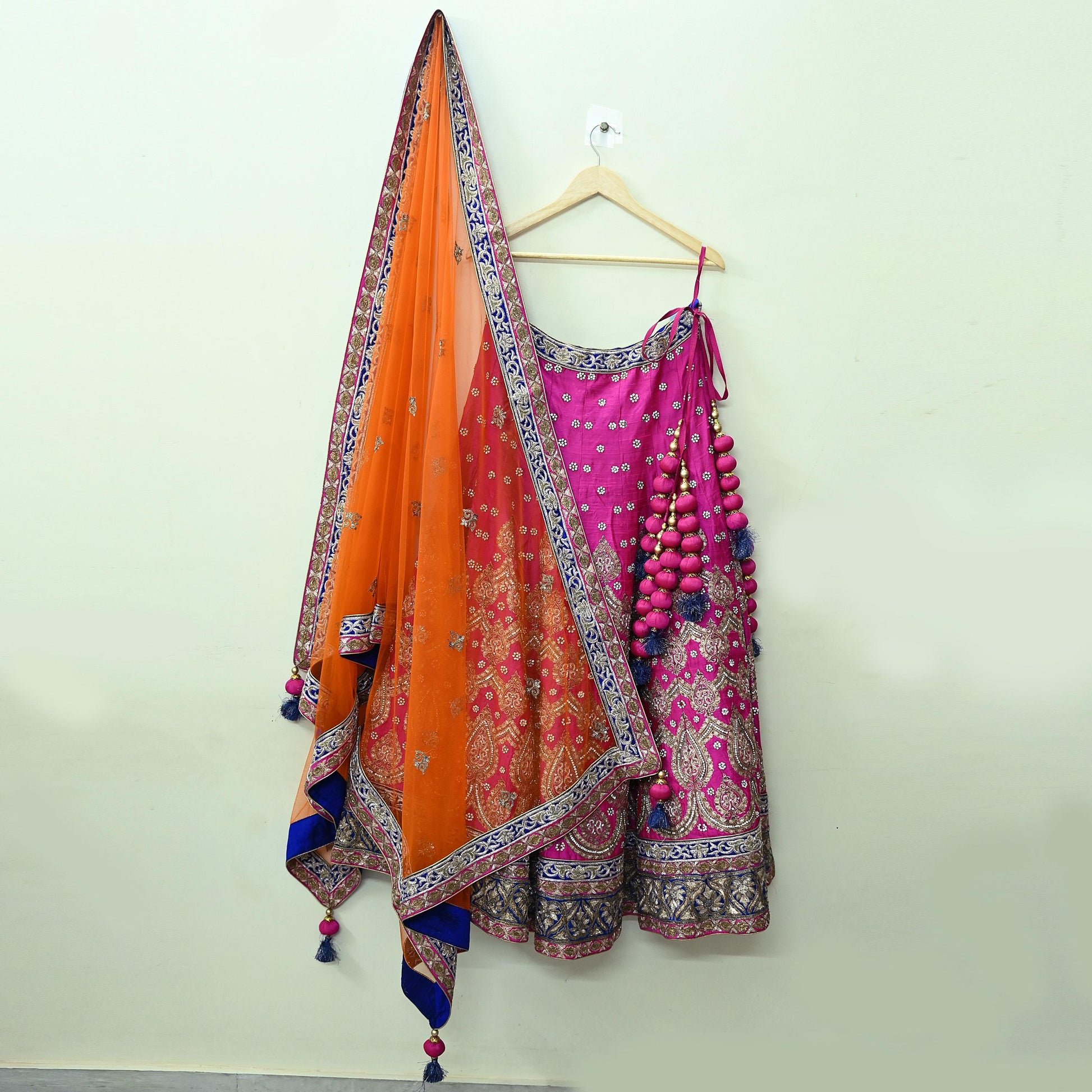 Stunning Hand Embroidered Heavy Lehenga, Blouse, Dupatta 3pcs Set By Designer Sabyasachi Pure Chanderi Silk/Net Dupatta/Brocade Blouse Fabric /Skirt In Magenta & Orange Color Fabric. This one of a kind item is difficult to express in words. Border feature is floral design embroidered Pure Metallic Golden & Silver Zardozi/ Dabka, Zari, Golden Sequins, Golden Glass Beaded, White Beaded, work embellished work is the highlight of the dupatta. Also you can see similar work with floral pattern in center part adds to its beauty. Beautiful Blue Border On Lehenga & Blue & Magenta Border On Dupatta work is giving a fabulous look to the Lehenga Set. Awesome one !!!