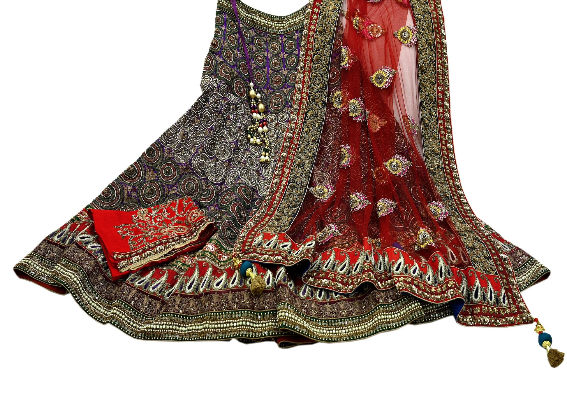 *Stunning Hand Embroidered Brocade Heavy Lehenga, Blouse,Dupatta 3pcs Set By Designer Sabyasachi Red Colored Net Dupatta & Skirt In Purple Color Pure Chanderi Silk Fabric.