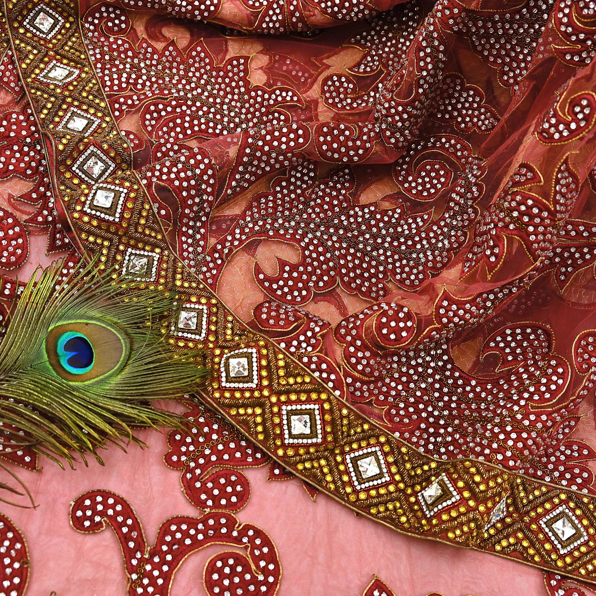 *Pallu & Border Features Floral Design Embellished With copper Zardozi/Dabka Zari, white & Yellow Stones, Golden Sequins, red & white beaded, white pearl like beaded Work.