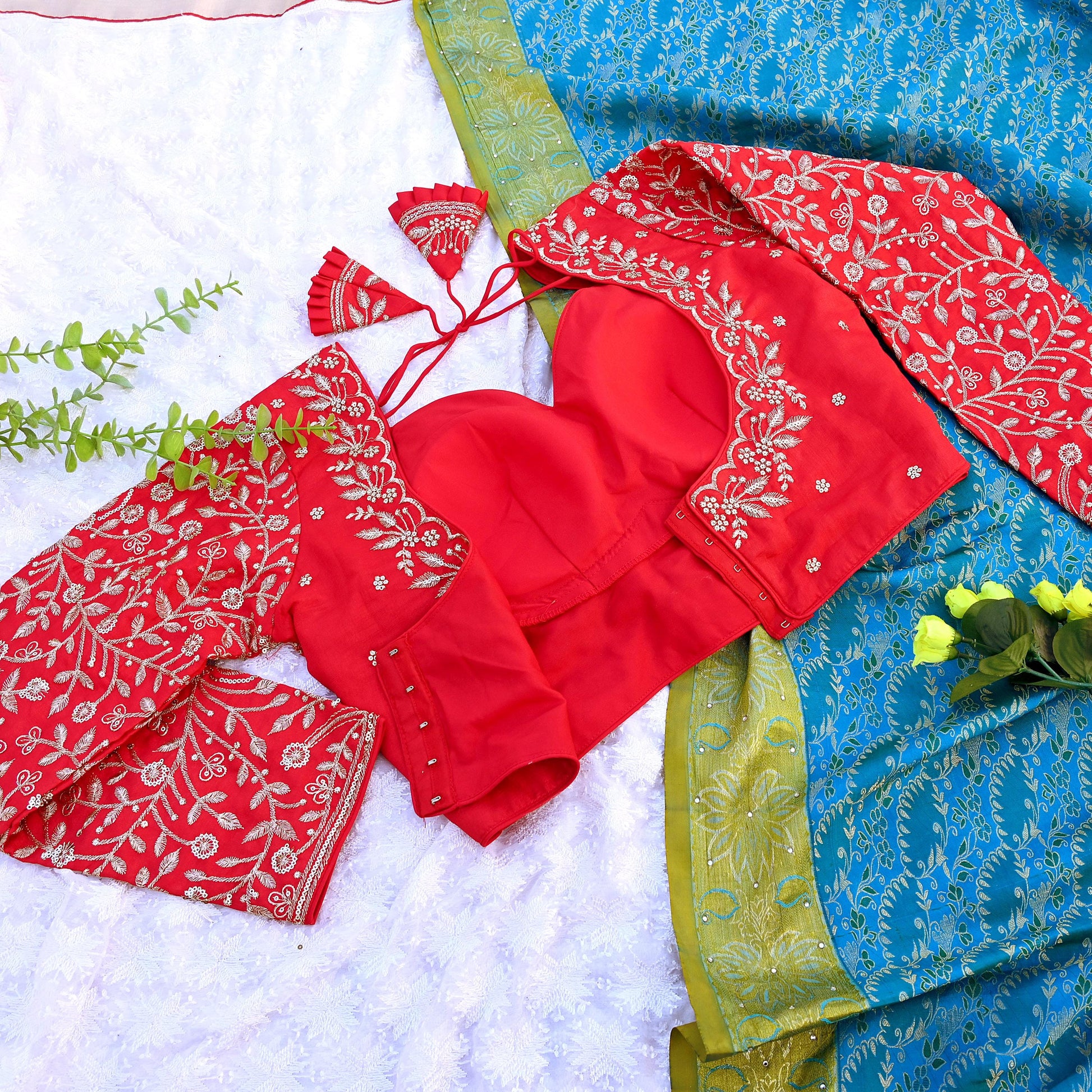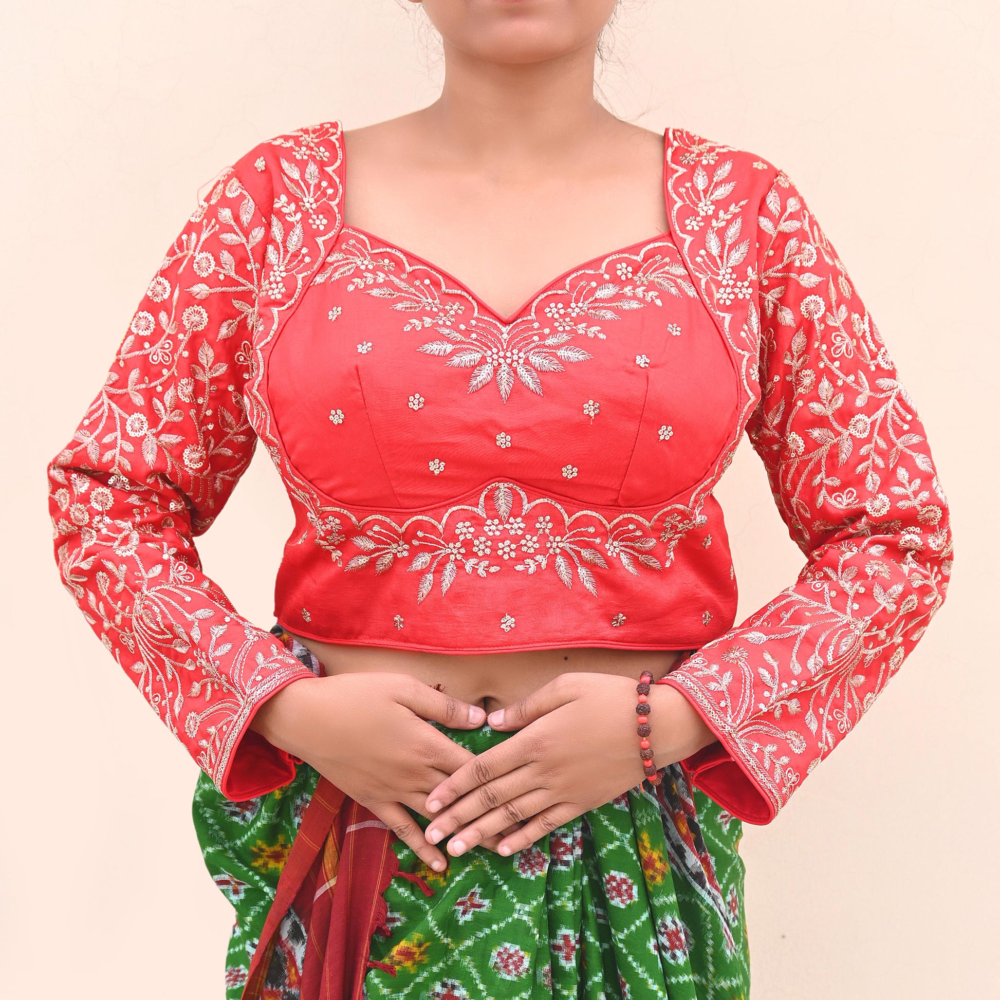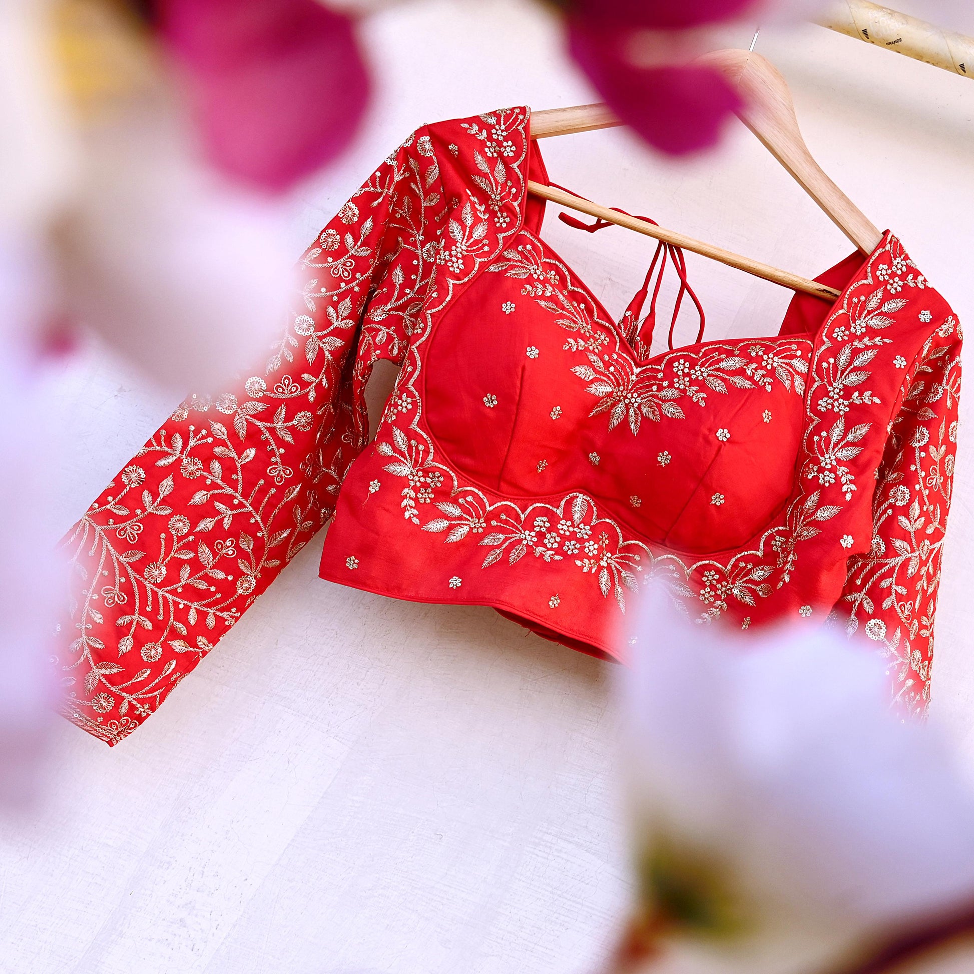 Indian New Red Chanderi Hand Embroidered Padded Blouse/Top/Crop M Size Party wear Bollywood