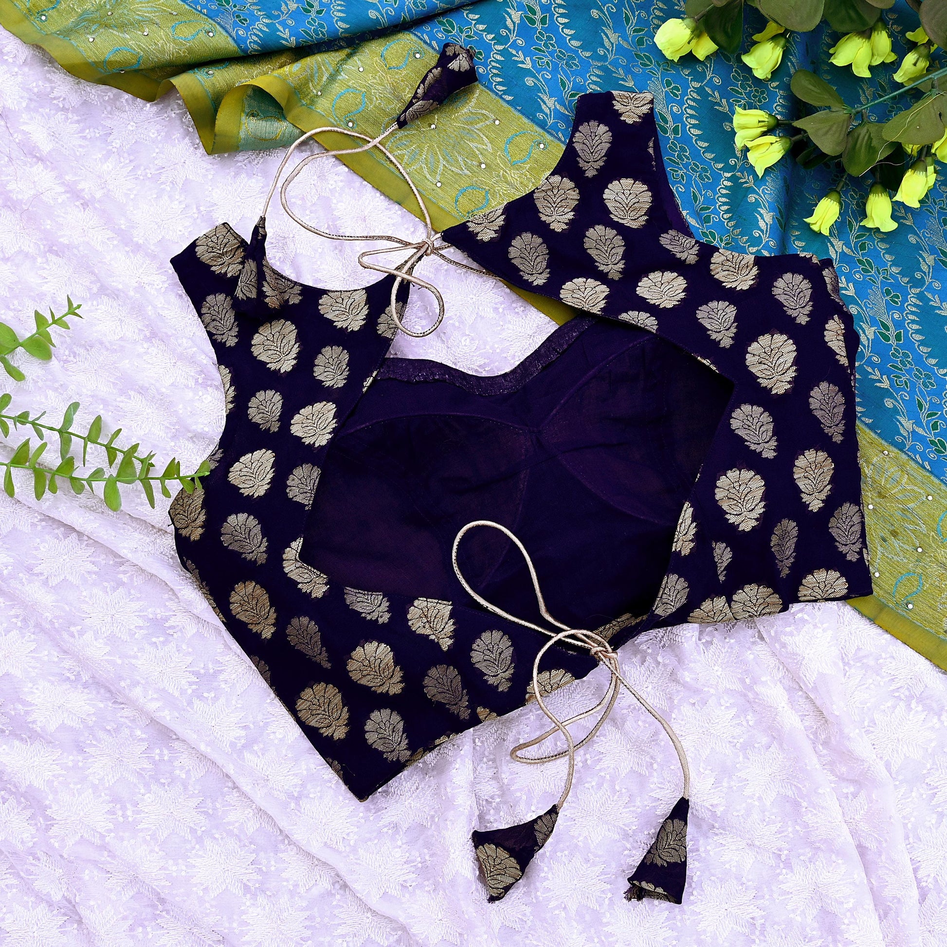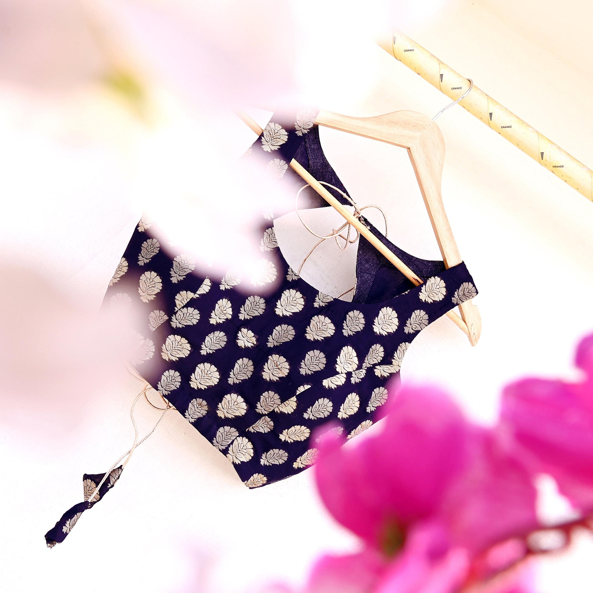 A one-of-a-kind creation, Floral Design richly adorned with golden woven Zari work.