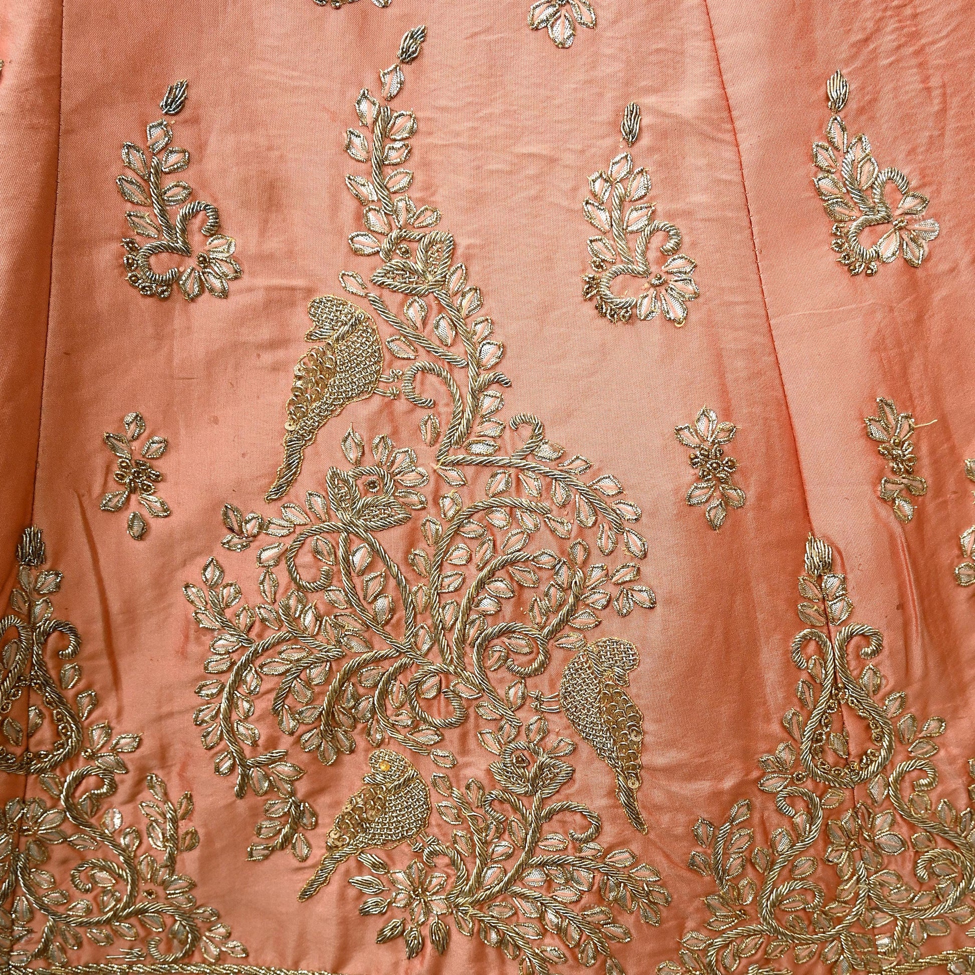 Dupatta: Made from Peach net, the borders are adorned with pure metallic golden zardozi/dabka work, golden zari, golden sequins, Golden glass beads, Golden Gota Patti and intricate work. The center features delicate floral & Parrot motifs for an elegant finish.