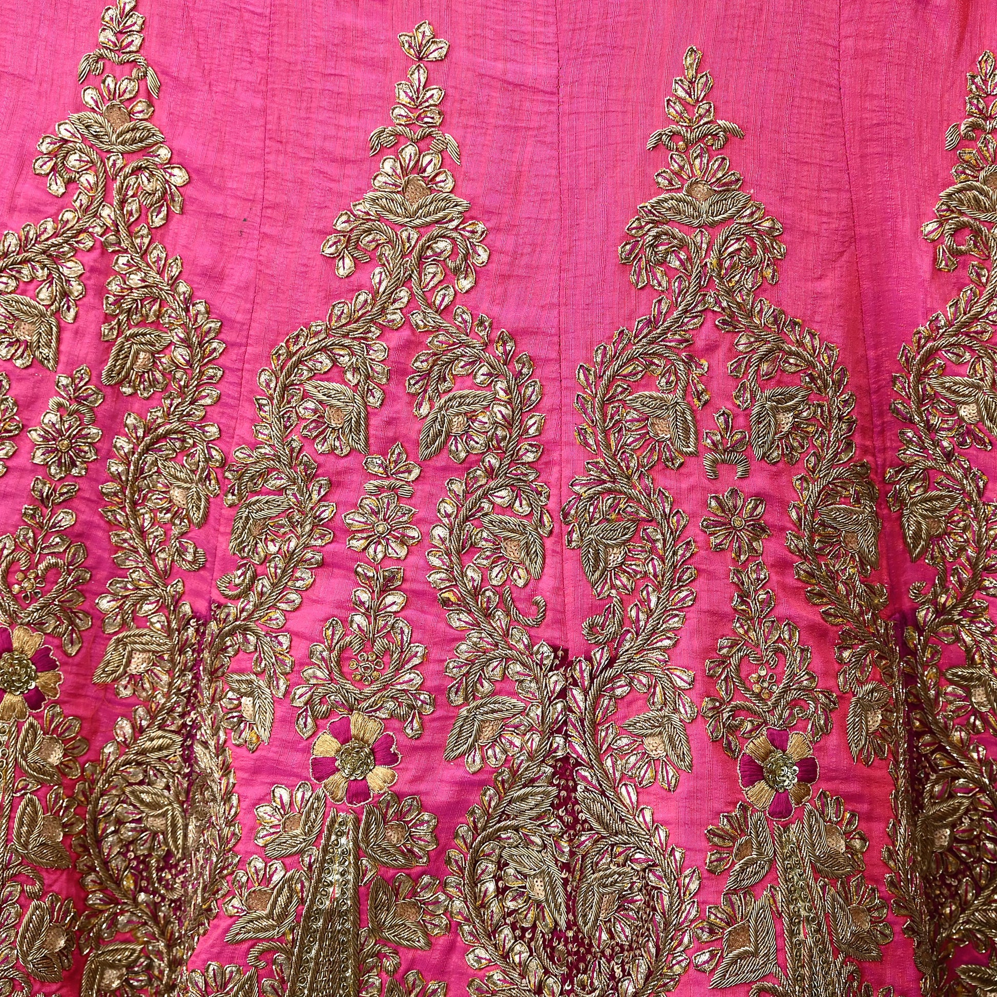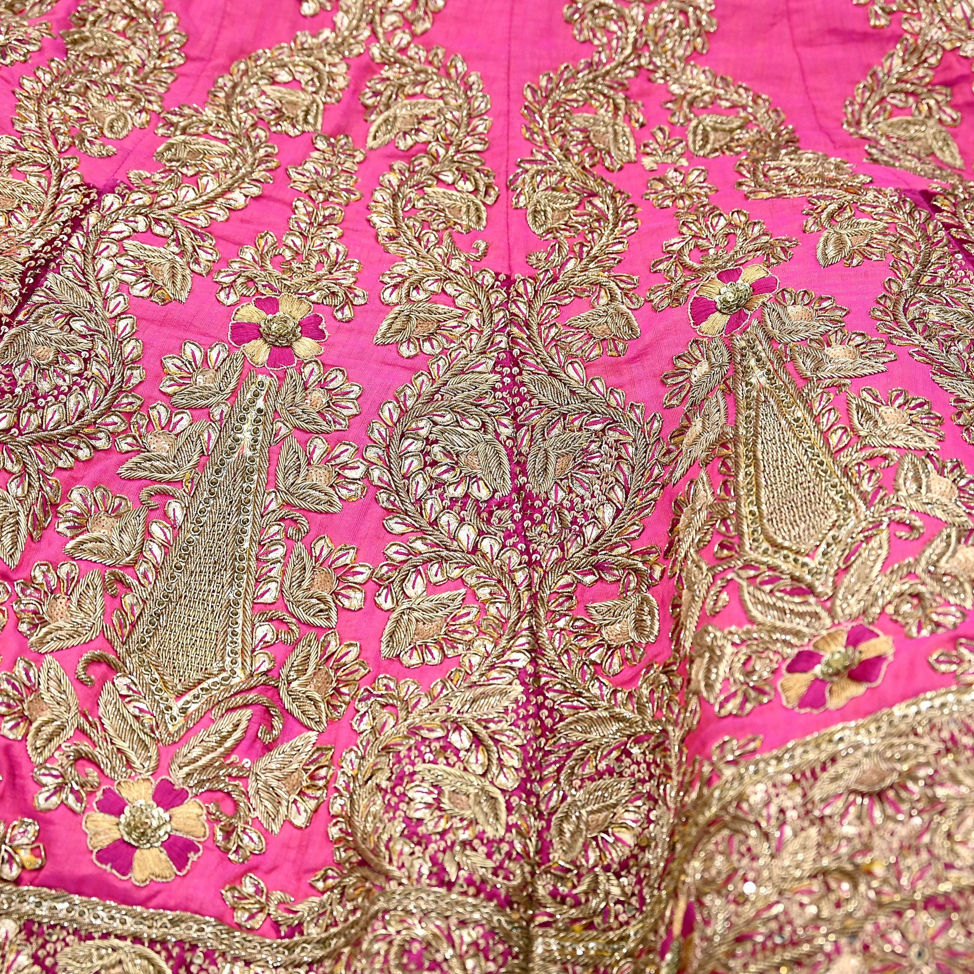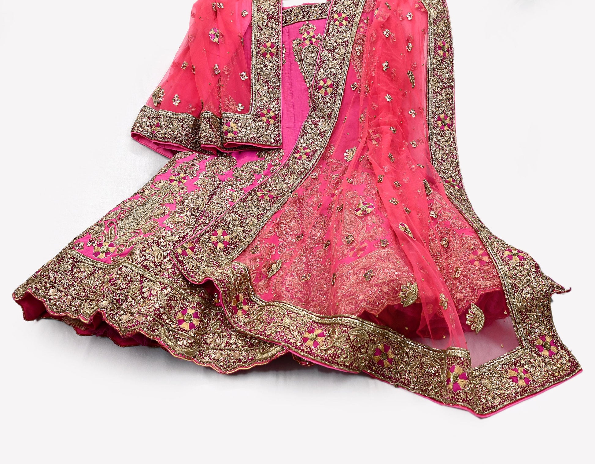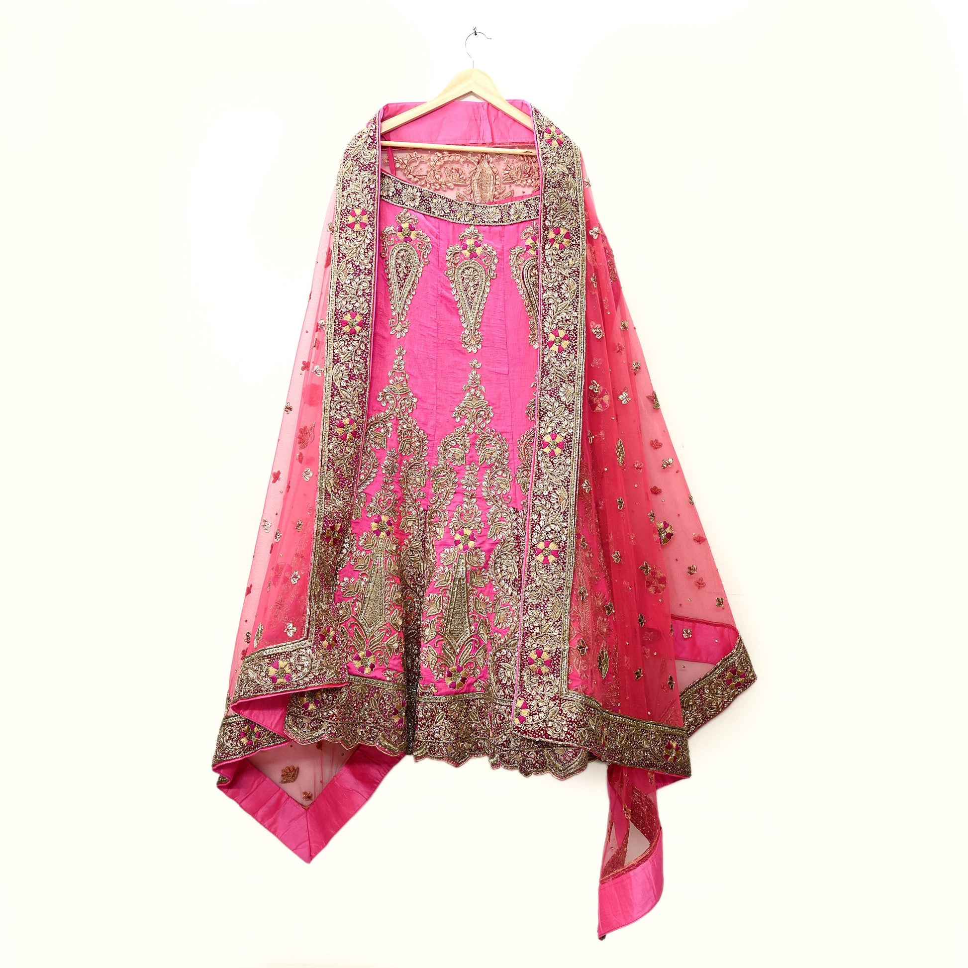 Step into regal elegance with this luxurious lehenga set, crafted from net in a rich Pink tone. This new, one-of-a-kind creation includes a heavily embroidered lehenga skirt, matching Peach net dupatta.