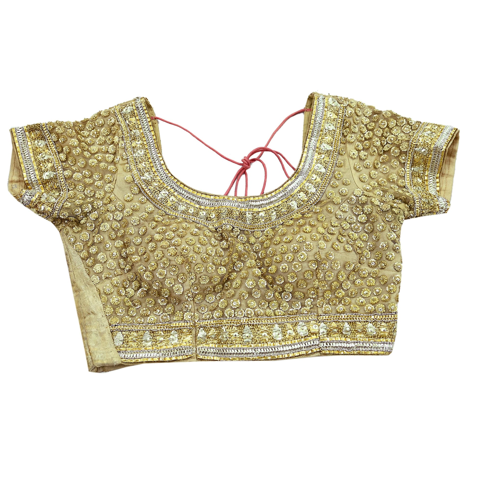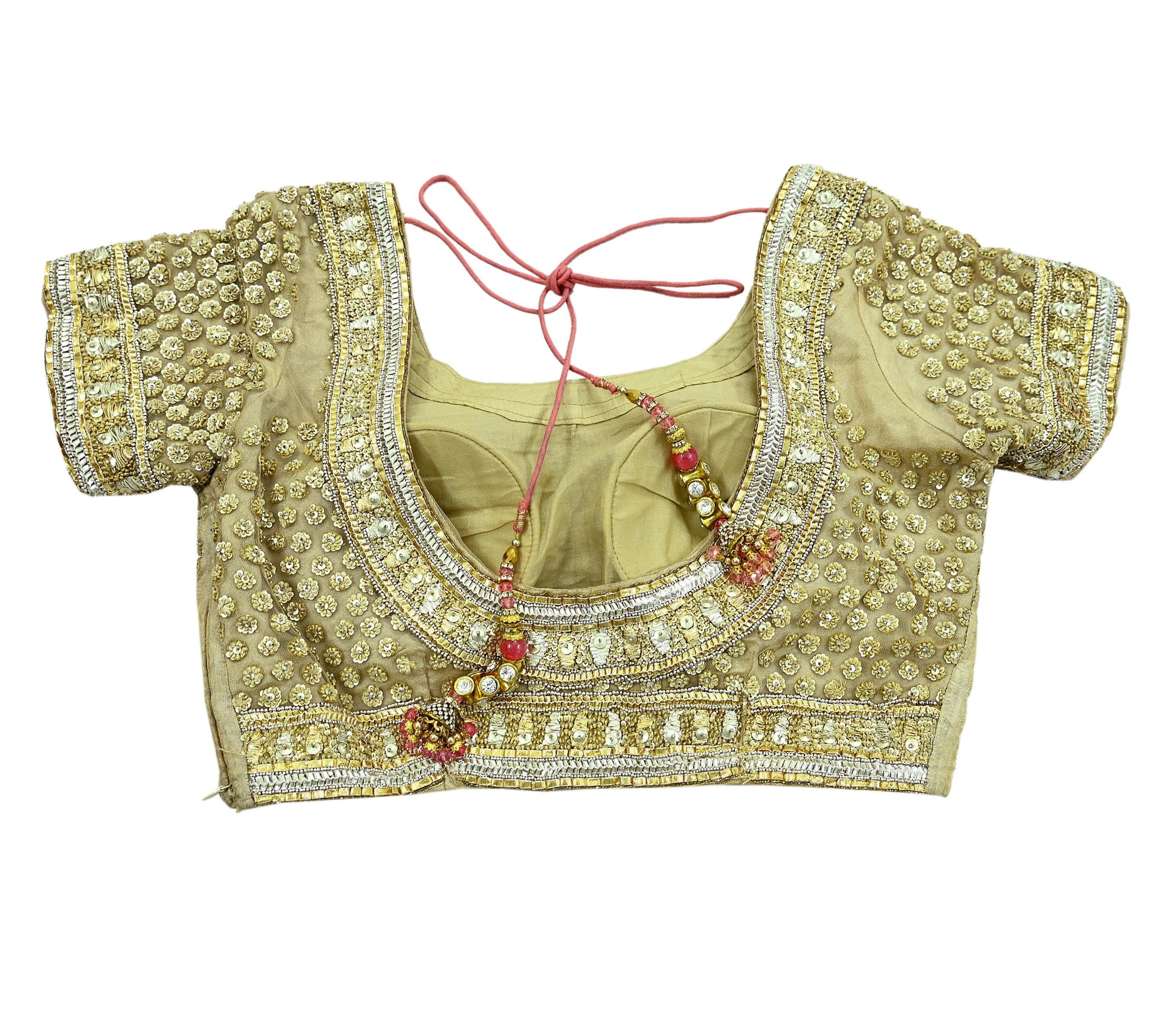 Pre-Owned Stunning Heavy Hand Embroidered By Designer Abu Jani Padded Blouse/Top/Crop With Side Zipper Beige Color Net Fabric. This one of a kind item is difficult to express in words. Golden Gota patti, Golden Sequins, Golden Beaded, Beige Thread, Golden Glass Beaded work With Back Dori Style embellished work is the highlight of the Top. Also you can see similar work with Floral pattern in center part adds to its beauty. Beautiful Hanging On Back Side work is giving a fabulous look to the Blouse. Awesome one !!!