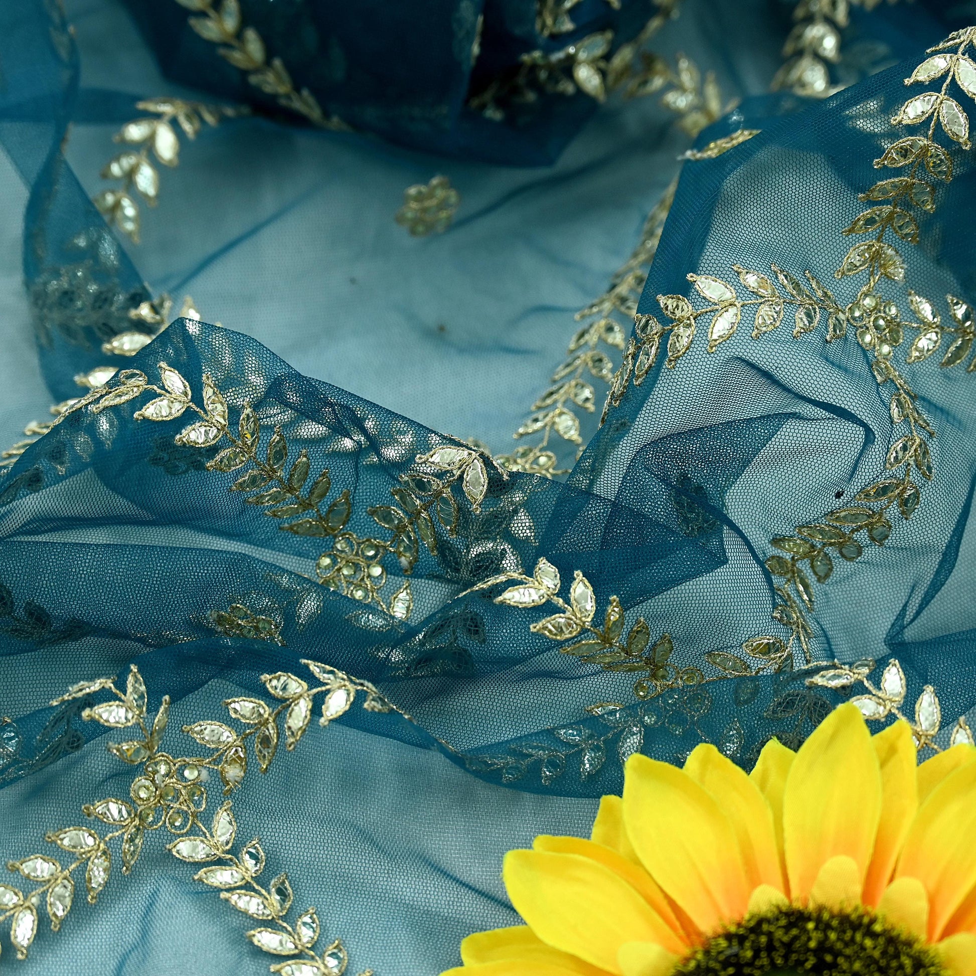 Stunning Beautiful Heavy Dupatta Hand Embroidered By Designer Abu Jani Net Dupatta/Stole In Blue Color Fabric. This one of a kind item is difficult to express in words. Border feature is floral design embroidered Golden Patches/ Gota, Golden Dori, White & Golden Beaded work embellished work is the highlight of the dupatta. Also you can see similar work with floral pattern in center part adds to its beauty. Beautiful Tassels/Hanging work is giving a fabulous look to the dupatta. Awesome one !!!