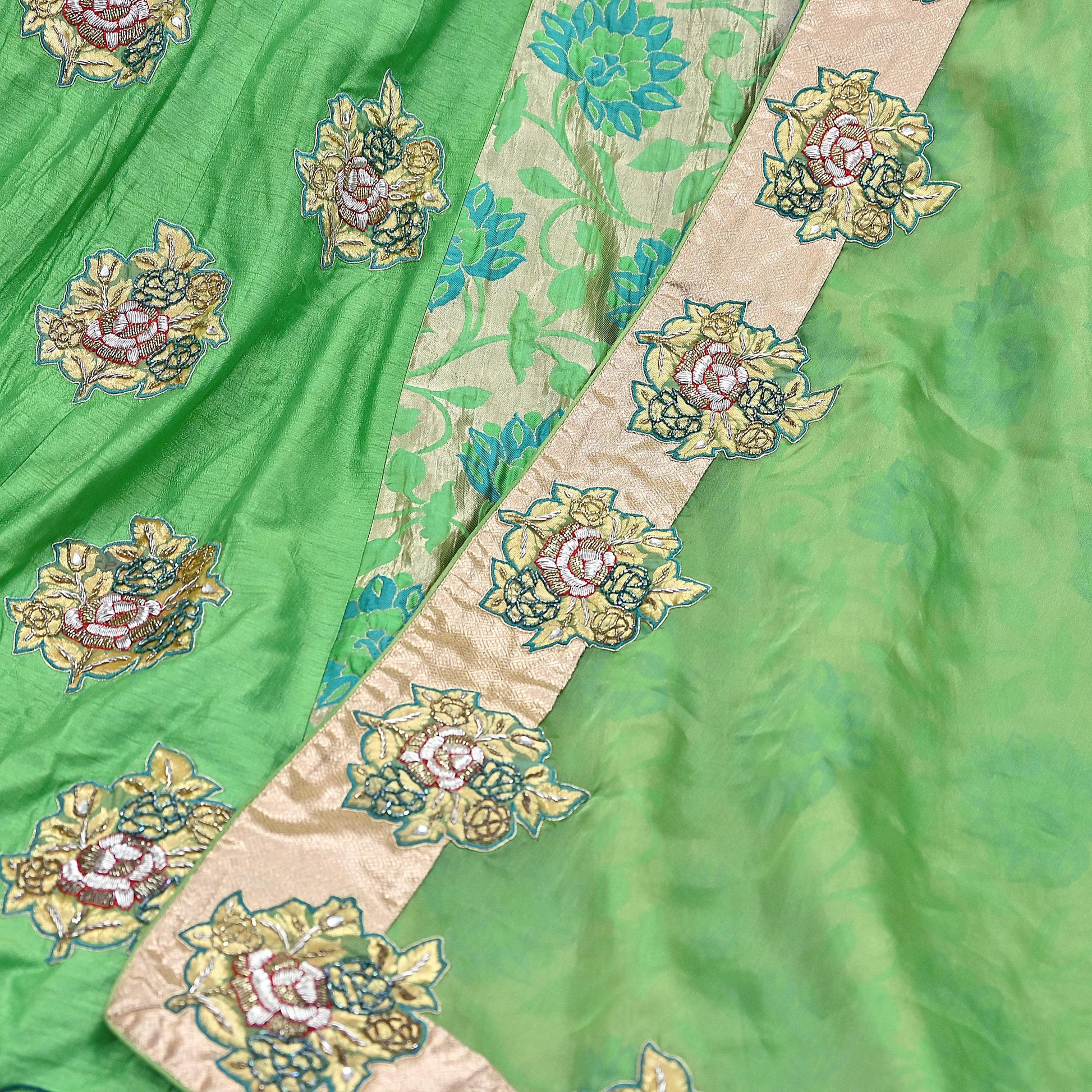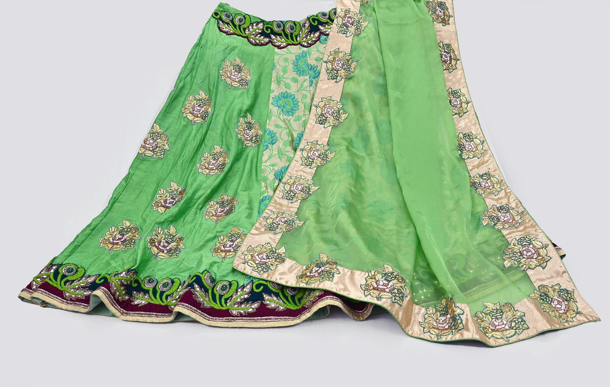 Indian Pre-owned Heavy Green Pure Chanderi Silk Hand Embroidered Lehenga Set Of 2pcs Designer By Manish Malhotra Party Wear