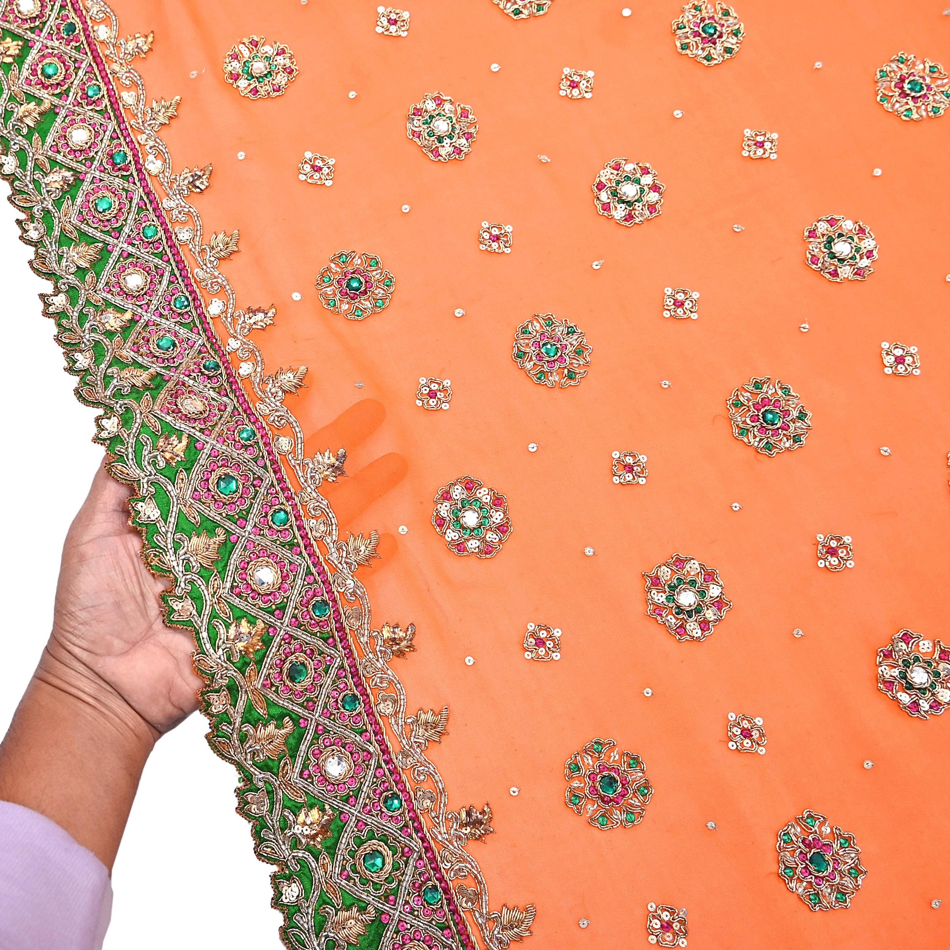 Stunning Beautiful Hand Embroidered Heavy Dupatta Designer By Manish Malhotra orange Colored In Pure Georgette Silk Fabric. This one of a kind item is difficult to express in words. Border feature is floral design embroidered pure metallic golden & Silver zardozi/dabka embroidery, golden zari, golden sequins, yellow beads, Golden beads, Golden Glass Beaded, Multi Stones, Multi Thread work embellished work is the highlight of the dupatta. Also you can see similar Zardozi, Beaded work with floral pattern in center part adds to its beauty. Heavy Brocade cut work Border is giving a fabulous look to the dupatta. Awesome one !!!